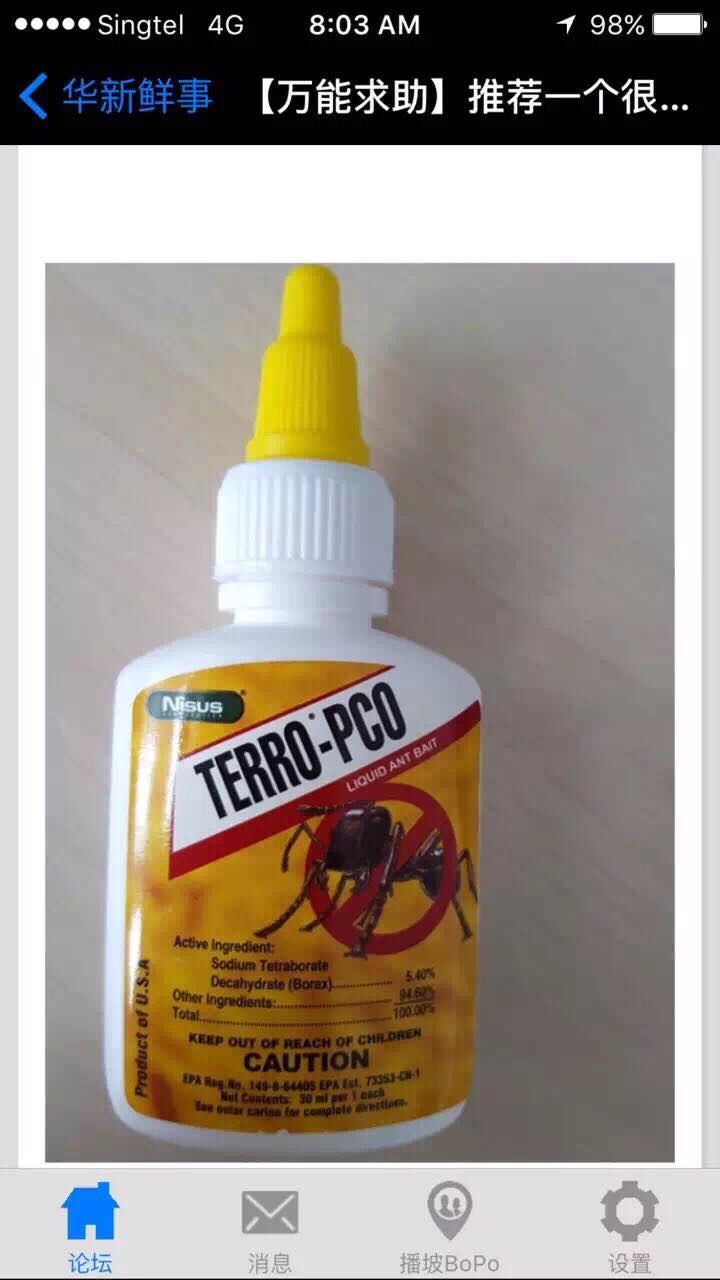 推荐过好几次这个杀蚂蚁药水了几年前家里也是蚂蚁泛滥,只用了两个晚上这个药水,用量也就几滴,蚂蚁从此就绝迹了。真的就是一只也看不见了。NTUC Fairprice买的,也是看版上别人推荐的,确实好用。
