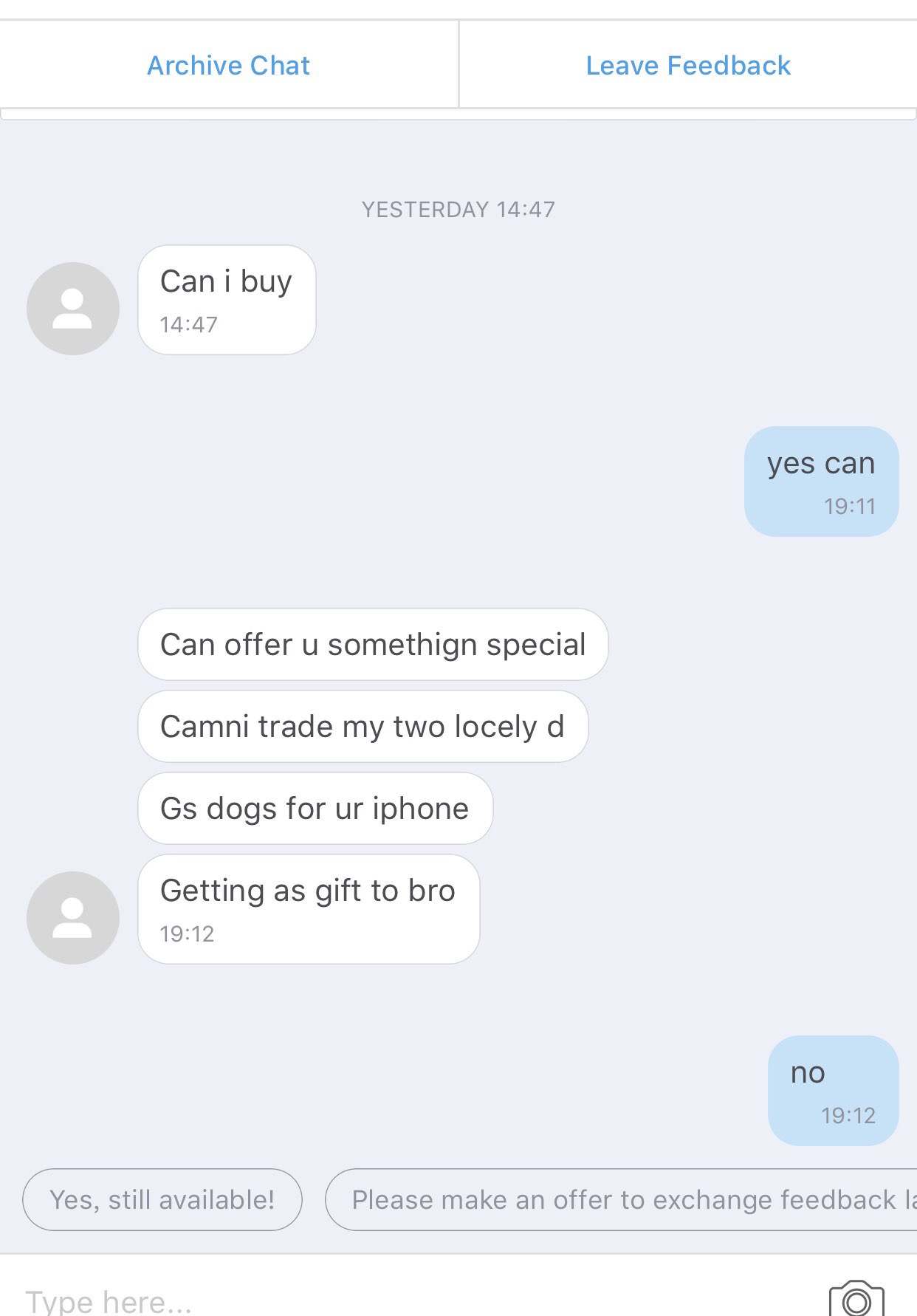 当时感觉卖挺便宜了搜了下有些用过俩月的都卖我这价钱。我就觉得我这全新的 也没要高价不愁卖。放出一天就来了20个offer。有出很低的,也有五六个靠谱的在小刀的。恰在这时这个买家offer我的价格,我就以他优先了。。唉。现在想想真不如卖给刀20自取的了。