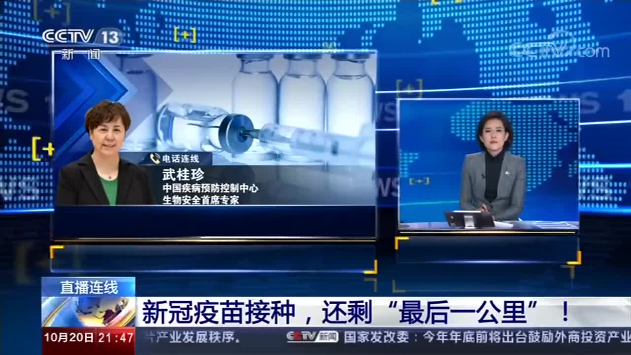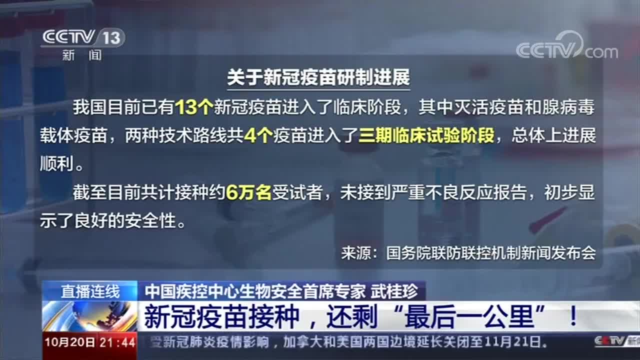 全球新冠肺炎疫情还处在大流行阶段,作为控制传染病公认的、最有利的科技手段,疫苗自然也成为了大家关注的焦点。20日下午,一场关于“新冠疫苗”的发布会召开,明确年底我国新冠疫苗产能可达6.1亿剂,目前4个疫苗进入了三期临床试验阶段,共接种试验者6万人,未接到严重不良反应报告,新冠疫苗离我们越来越近。《新闻1+1》连线中国疾控中心生物安全首席专家武桂珍,共同关注新冠疫苗接种,还剩“最后一公里”!