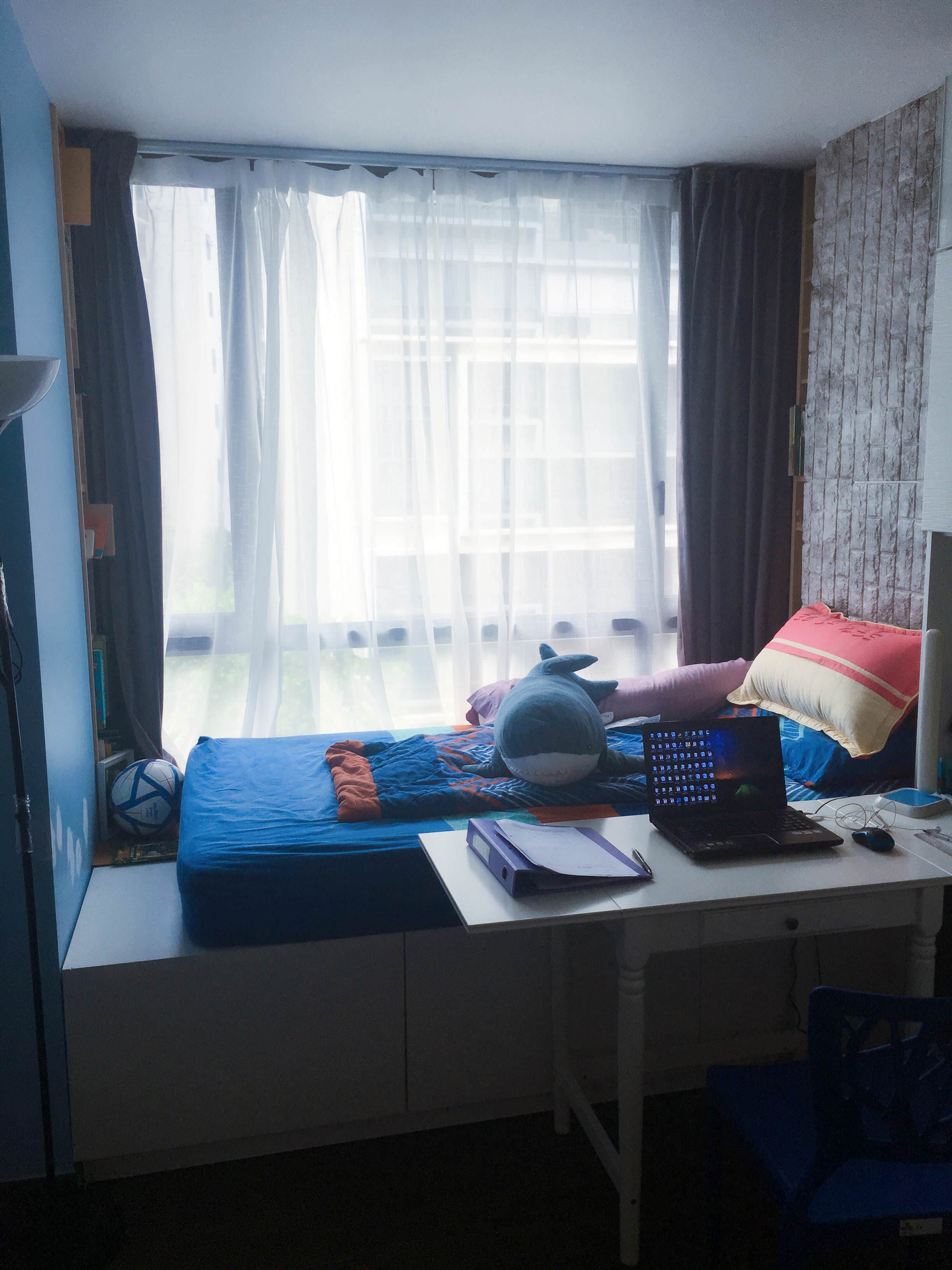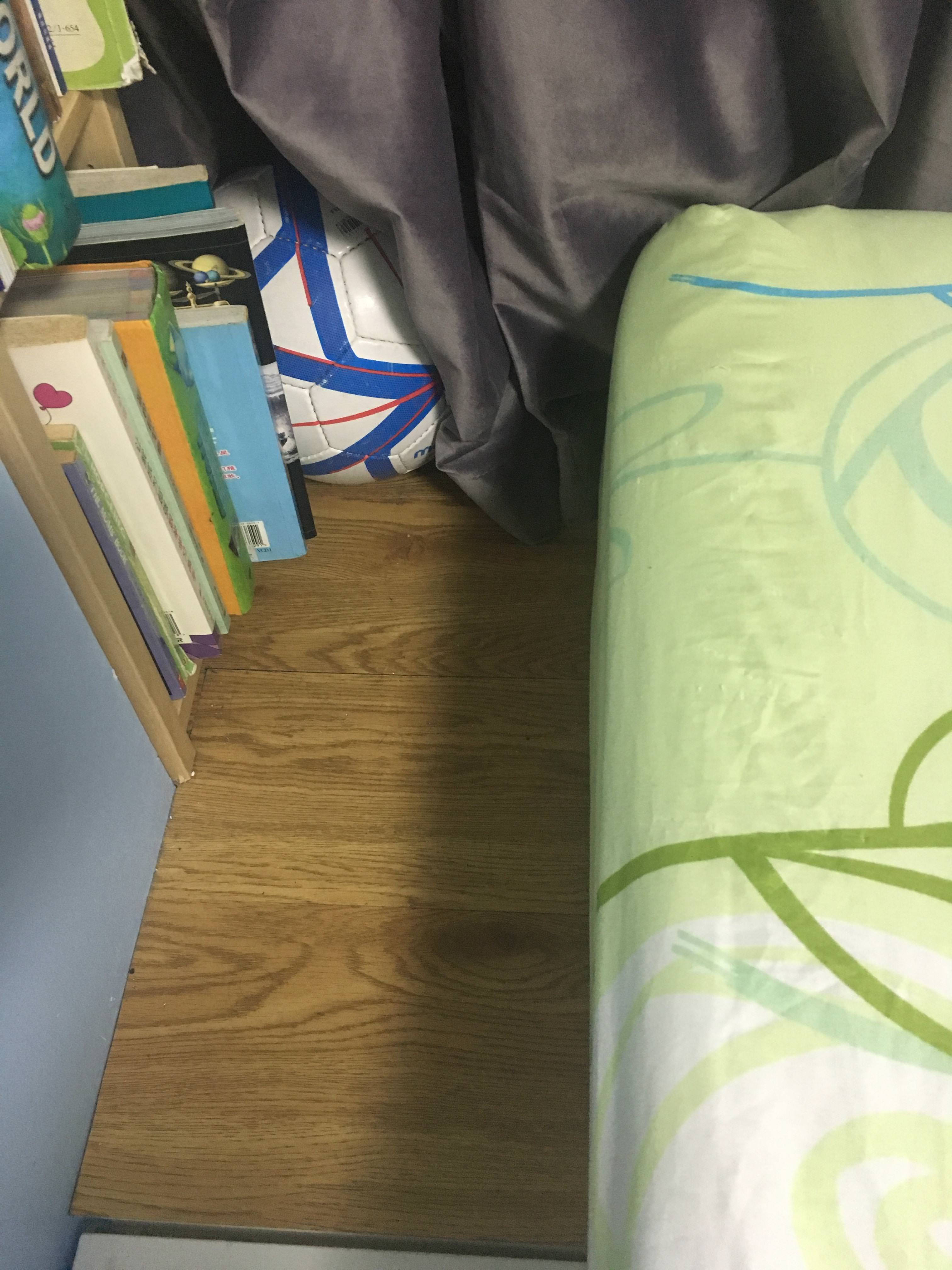一立方米$85,总共15片,选好颜色付了钱,就准备扛上了,老板大喊:别自己拿,很重的,叫一辆车吧。于是Grab了一辆直接到仓库门口,老板帮忙扛上了车,司机送到家楼下,自己扛了一下,天哪,笨重得要命,还好有电梯,要扛的地方不多。一回家立刻动手干活,在这之前YouTube 了教程,非常简单的,一片片接在一起,拼接的地方量一下长度,用工具刀一割,掰一下就断开了。也可以用胶水的。我没用,因为放飘窗上,上面放床褥。这种PVC材料esnq拼好是这样