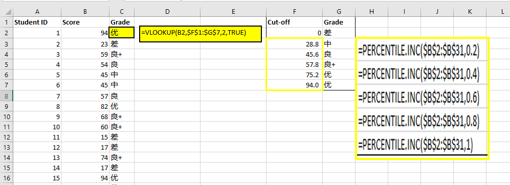 dssg • • 9190 次浏览给定一组数据,比如30个学生成绩(15分到95分),分成五个组(优 良+ 良 中 差, 把数据自动归到每个组中,所谓i的良+就是前1/5-2/5.要求直接用公式。