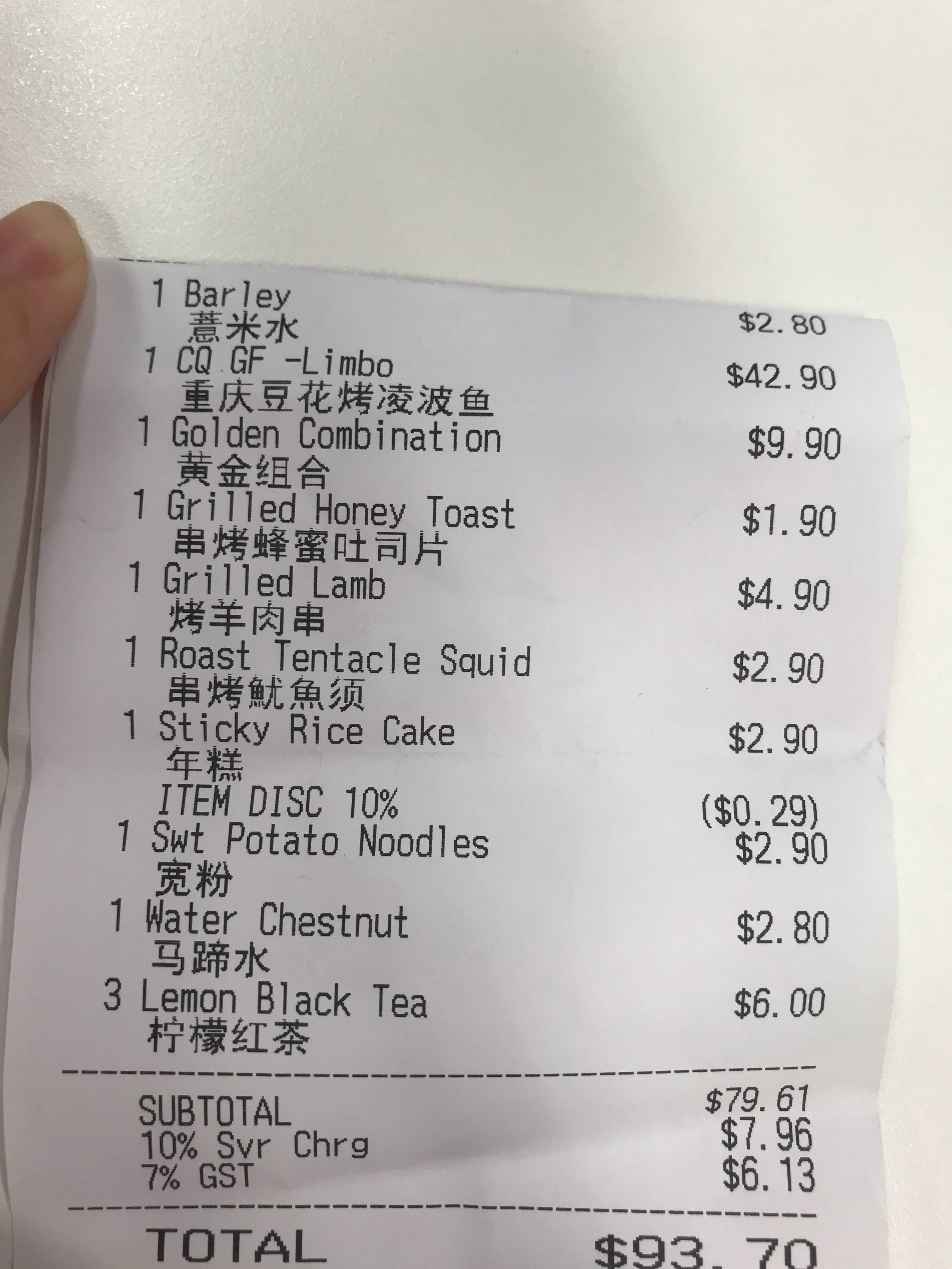 于是结账的时候问年糕没熟,这个年糕可以免掉吗,服务员说跟经理请示,然后五分钟跑回来说经理说最多给年糕打9折,execuse me!年才2.9打九折!我就回了一句,那算了,真的是好气,当人是乞丐吗?2.9打九折!还不如直接说不行,要付年糕的钱呢!