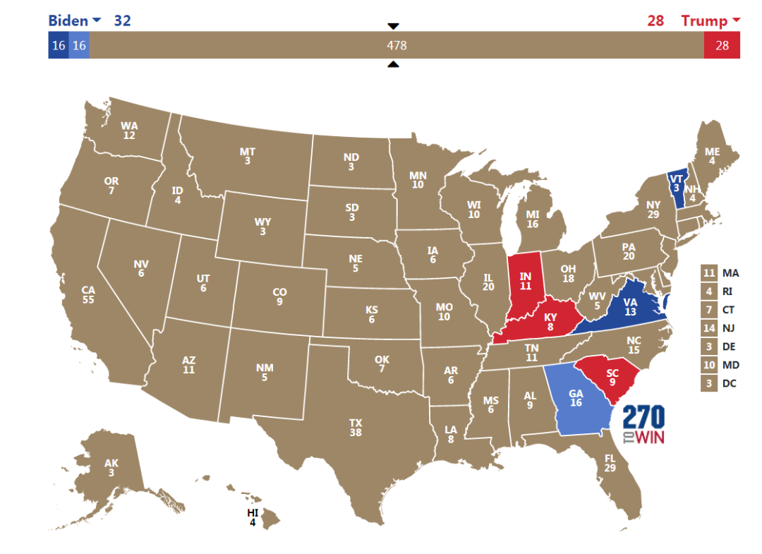 最早开票的是佛蒙特(3票)、维吉尼亚(13票)、乔治亚(16票)、南卡罗来纳(9票)、印第安纳(11票)、肯塔基州(8票)。深蓝、深红相信变化不大,唯一看点是乔治亚,拜登目前领先。