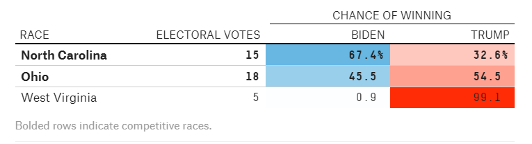 这个点有3个州,好处是历来点票速度都快,坏处是现在不太确定谁能赢。特朗普铁定能拿下西维吉尼亚(5票),拜登在北卡罗来纳(15票)赢面颇大,剩下手握18票的俄亥俄就成为关键,目前来看特朗普领先一些。