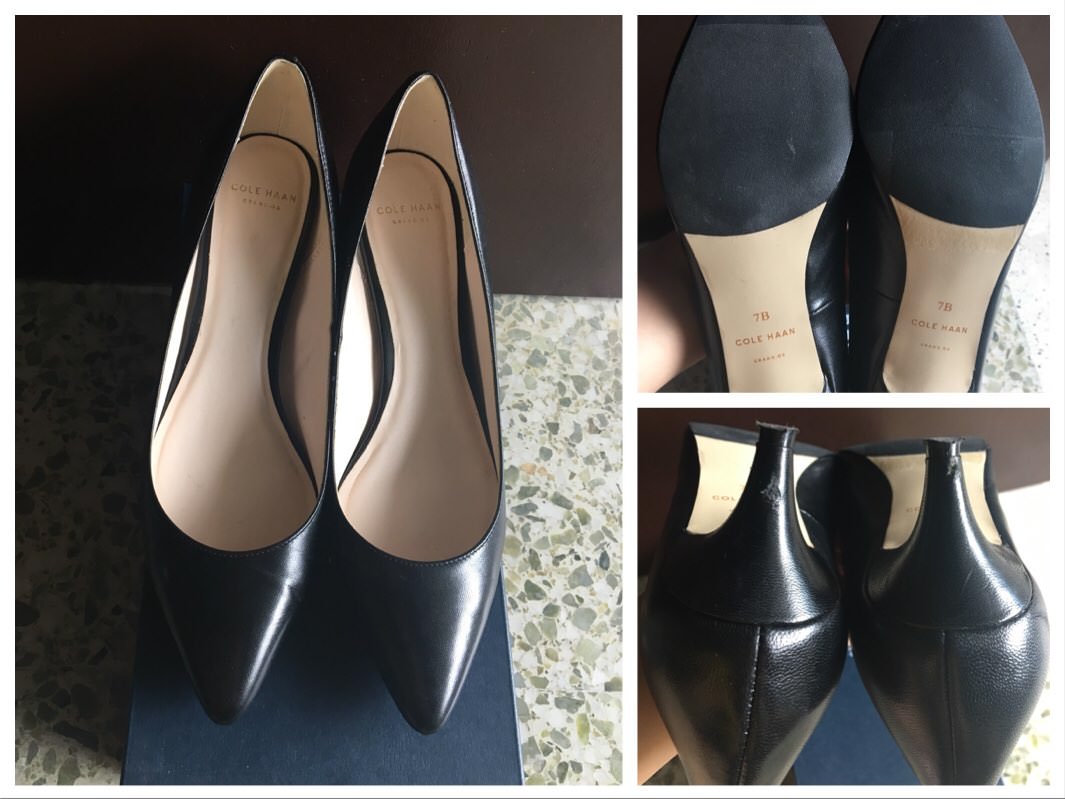 15元区1. Cole Haan黑色中跟鞋。很好走路,穿的次数很少,鞋底贴了防滑贴所以无磨损,鞋跟处有磨损,见图。