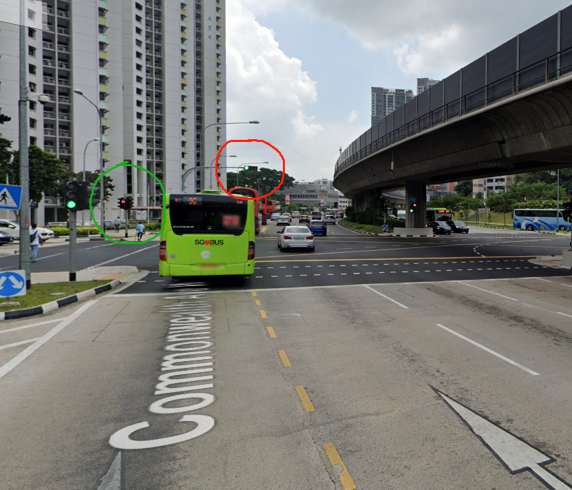 你可以参考和你同向的路边人行横道红绿灯倒计时,如图(红圈是你的同行路口红绿灯,绿圈是倒计时读秒,倒计时还有大把时间,绿转黄的概率就不高)