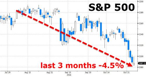 伴随着周三标普500指数下跌0.65%、7月7日以来首次收于2100点下方,美股大盘出现了又一个七日连跌。美国总统大选还有不到一周时间,市场对大选结果感到不确定,FBI重启对希拉里调查、共和党候选人特朗普在民调中反超,令最终结果存很大变数。