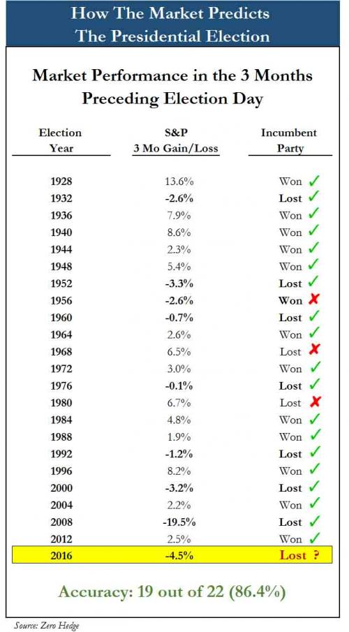 从1928年以来,股市在大选前的表现就与执政党候选人和“挑战者”候选人之间的赢家有比较密切的关联。具体来看,股市上涨意味着大概率执政党将“连续坐庄”,股市下跌则意味着在执政党失败的概率较大。除了1956、1968和1980外,这一特征均得到了体现,准确率高达86.4%。