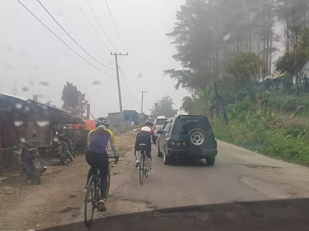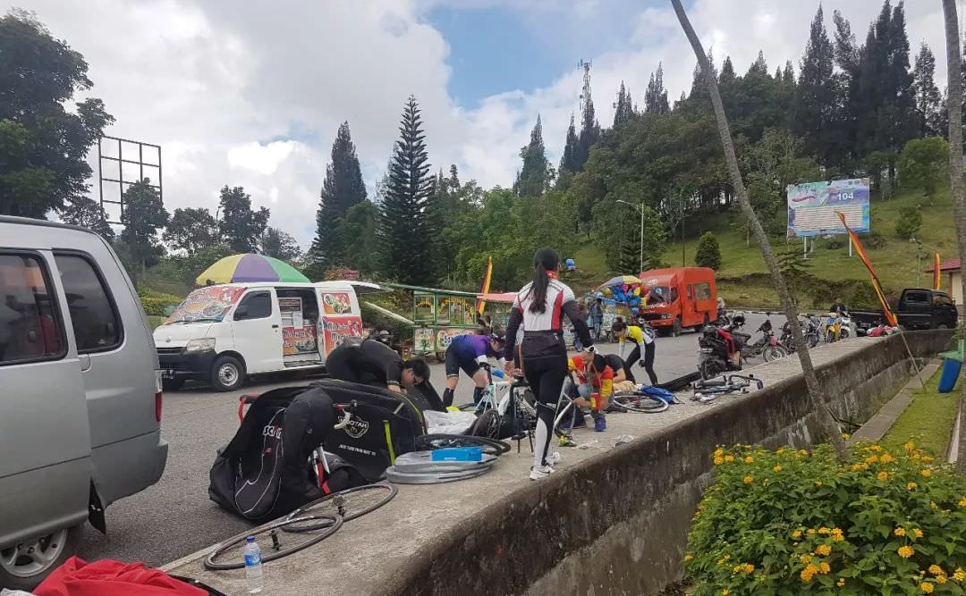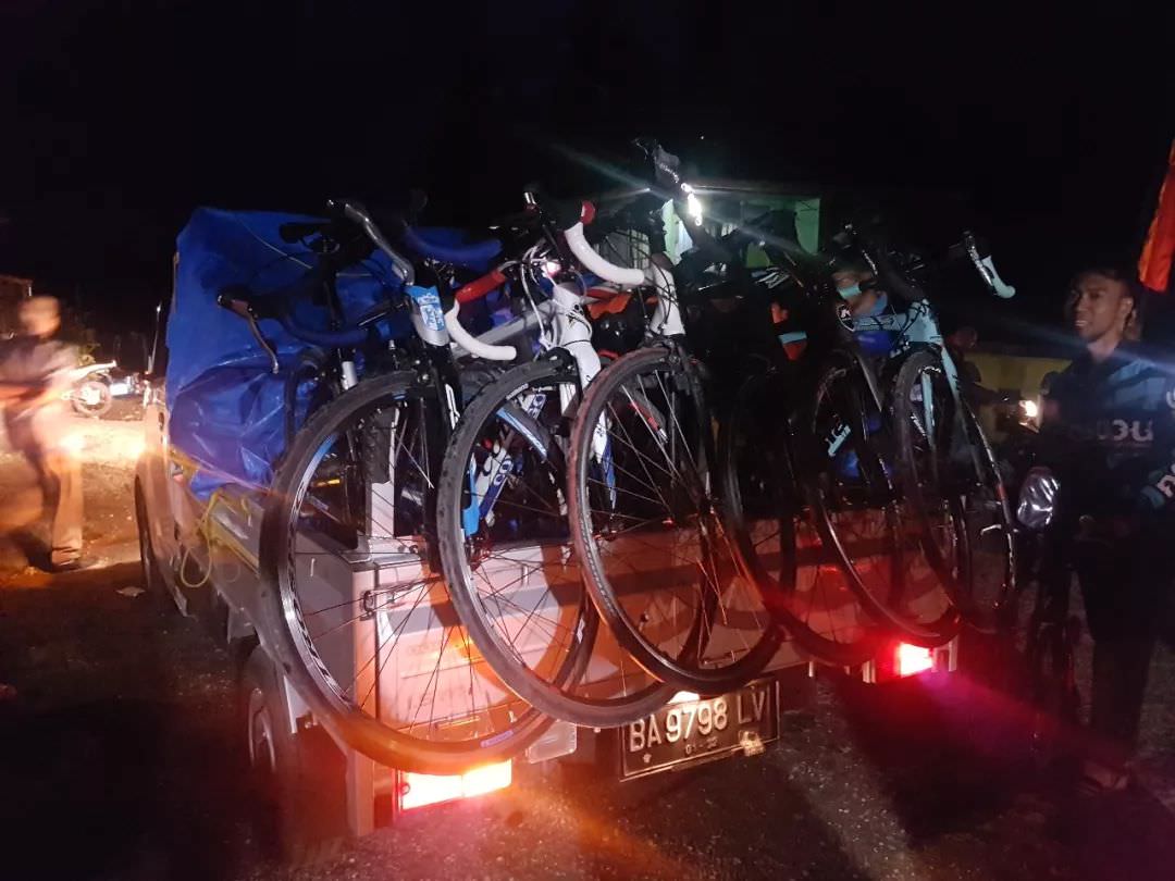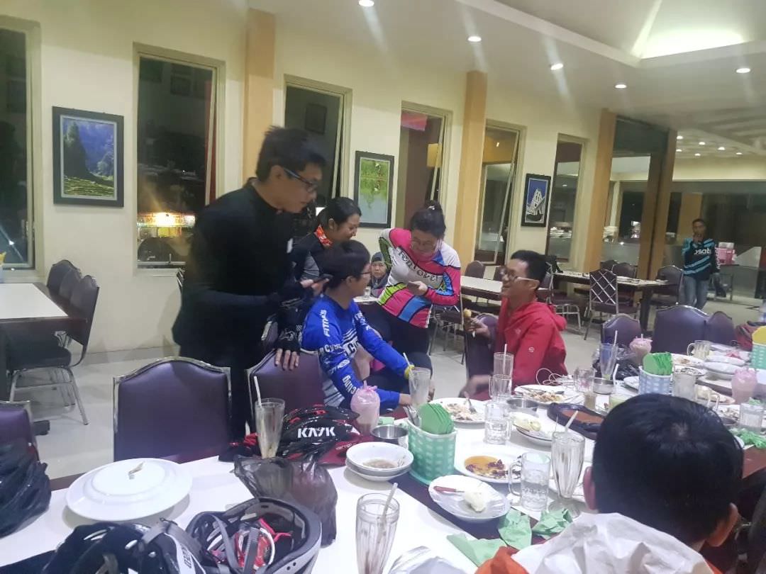 巴 淡岛上车遇到点问题,由于骑行队和玩咖组织的爬火山队共租了一辆大巴,人非常满。其余7辆装在车包里的车,无法放入货舱,只能等人都坐好了推上车放在过 道,从车头排一列直到车尾。一通忙活之后才安排妥当离开码头前往酒店入住。第二天一早又奔赴机场,飞往巴东市。落地后与当地导游会合,爬山队一个大巴,骑 车队一辆面包车和一辆皮卡,各奔目的地,分头之前照例搞了一个长桌午餐。