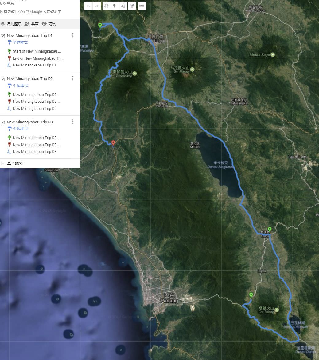这 次活动被命名为“三山两湖之旅”,从路线图上可以看到沿着公路经过三个火山,湖其实可以算是经过3个,右下角的迪吧瓦赫湖和塔郎火山,中间的辛卡拉克湖, 辛加郎和麻辣皮火山,以及第三天在山上眺望的马宁焦湖。总路程按谷歌地图的预计是219km,总爬升2.6km,总下降3.5km,实际上会有出入,因为 我们并没有完全照计划走。