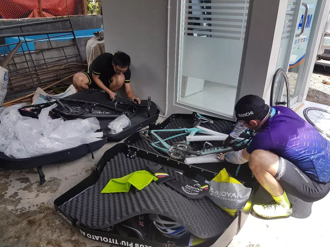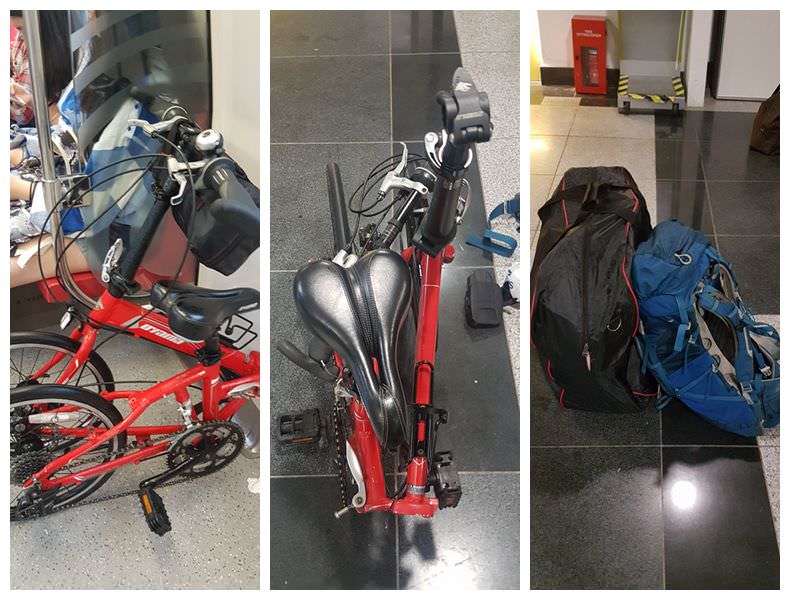 担 心归担心,一周后出发的日子还是到了。出行物品体现了我的游客心态——除开必备的车和物品,我还带了单反和长短镜头,备用电池等等——潜意识里我把这当作 去看风景的旅行,而不是去骑车。那时是周五,临近下班天空下起雨来,我背着十来公斤重的背包,候了雨小的间隙踩车溜到地铁站,对折起来推上了列车。出站 后,把车推进食阁吃了个晚饭,然后到码头全折起来装入袋子,和队友会合,准备登船去印尼巴淡岛。