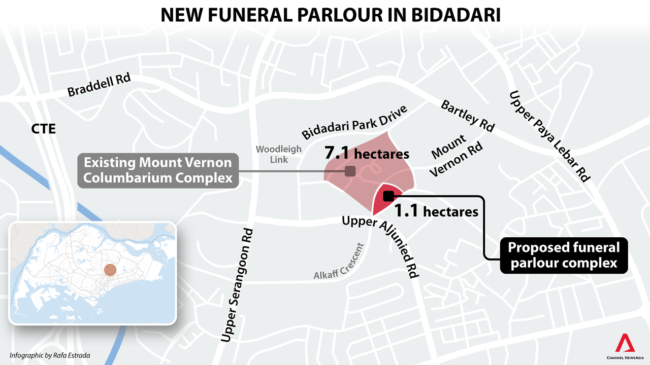 新综合大楼(Funeral Parlour Complex)将建在现有骨灰瓮安置所和殡仪馆的原址,但规模大幅缩小至1.1公顷,为占地7.1公顷的现有骨灰瓮安置所和殡仪馆面积的约七分之一。