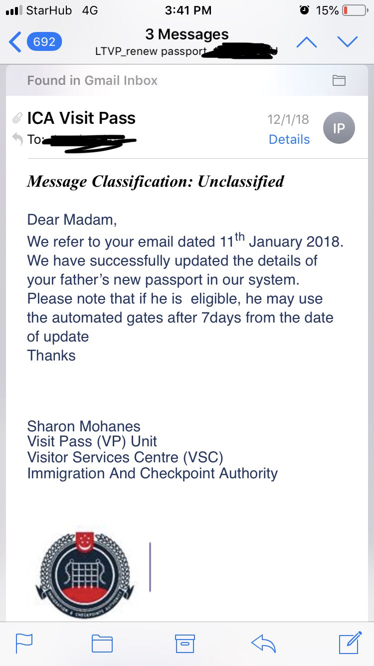 发邮件给ICAHolders of Long Term Visit Passes (LTVPs) issued by ICA who have renewed and obtained new passports may update their new passport details by forwarding the clear scanned copies in jpeg or doc format of their passport pages (showing their bio-data, passport number and date of issue/expiry of passport) and Long Term Visit Pass cards (front and back) as well as local sponsor’s NRIC (front) directly to [email protected].