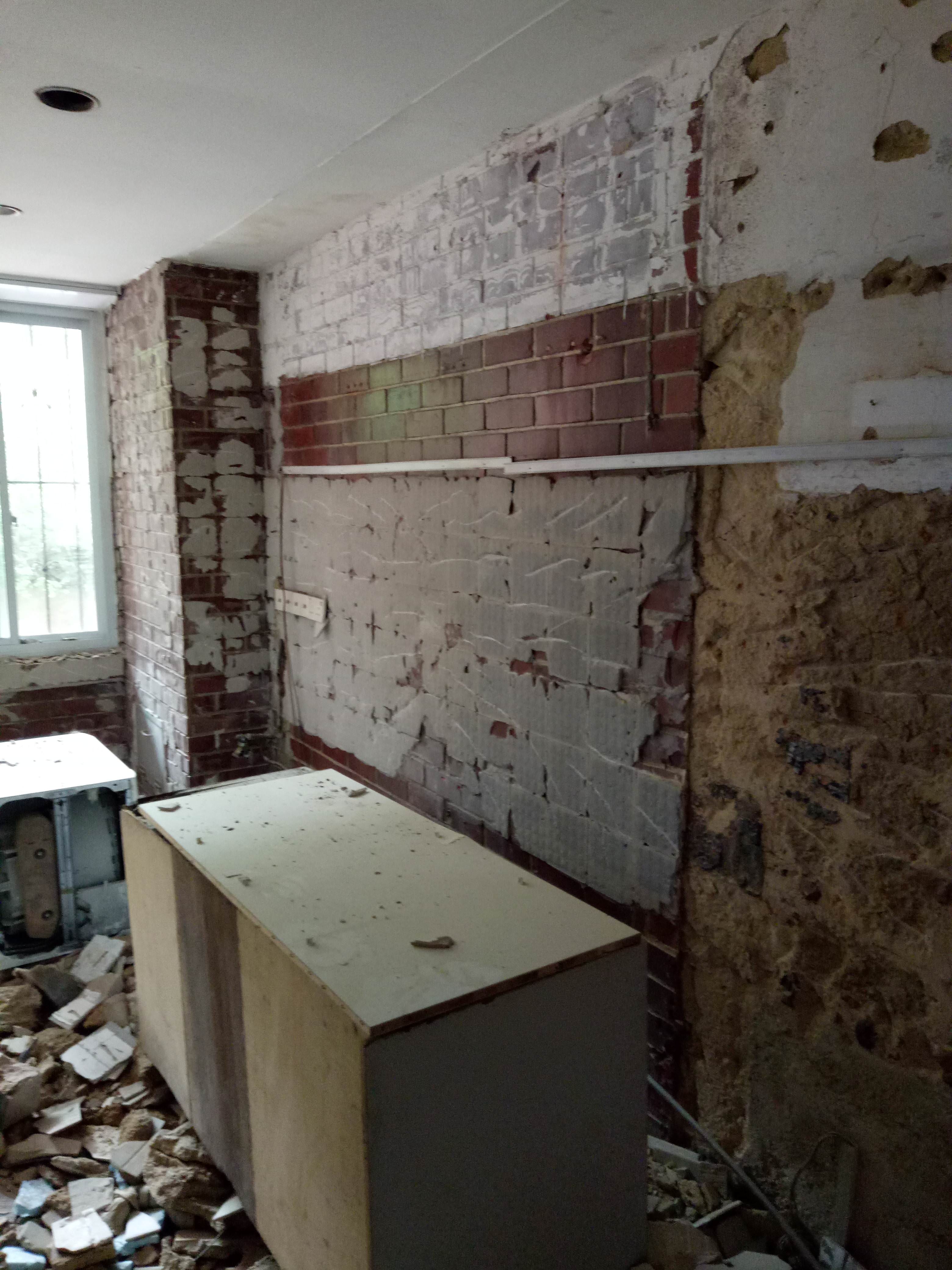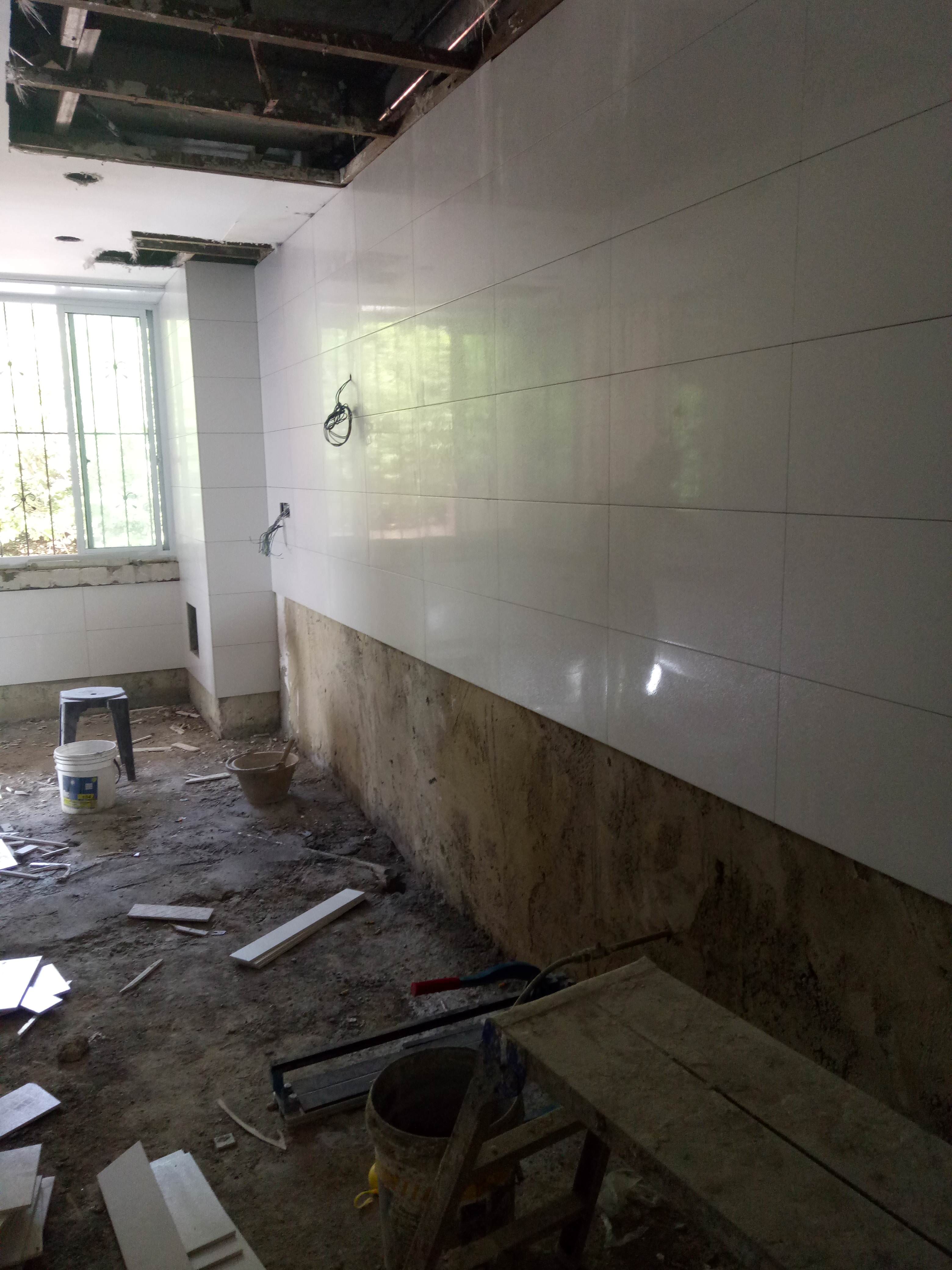 我一早就和我的ID沟通决定要装不锈钢橱柜。我最担心的问题是,橱柜来了怎么装?ID的意见是风险太大,他没有做过,他问了他的木工也是不敢接安装。但是他给我提供了非常大的帮助,比如反复测量核对管道电线的位置,提醒要注意的问题等等。跟多方确认了以后,我决定把厨房地面铺平(不做坡度),地砖铺满(一般定制橱柜是在地台上的,不锈钢的有柜脚)。墙砖一般情况是只铺中间,为了吊柜安装方便我决定铺到天花板,台面以下低柜后面的砖可以不铺。同时为了降低安装难度和对尺寸精准的需求,我决定抽油烟机不要放在柜体里面,这样铺满墙砖也非常必要。下图是铺砖以后的情况。