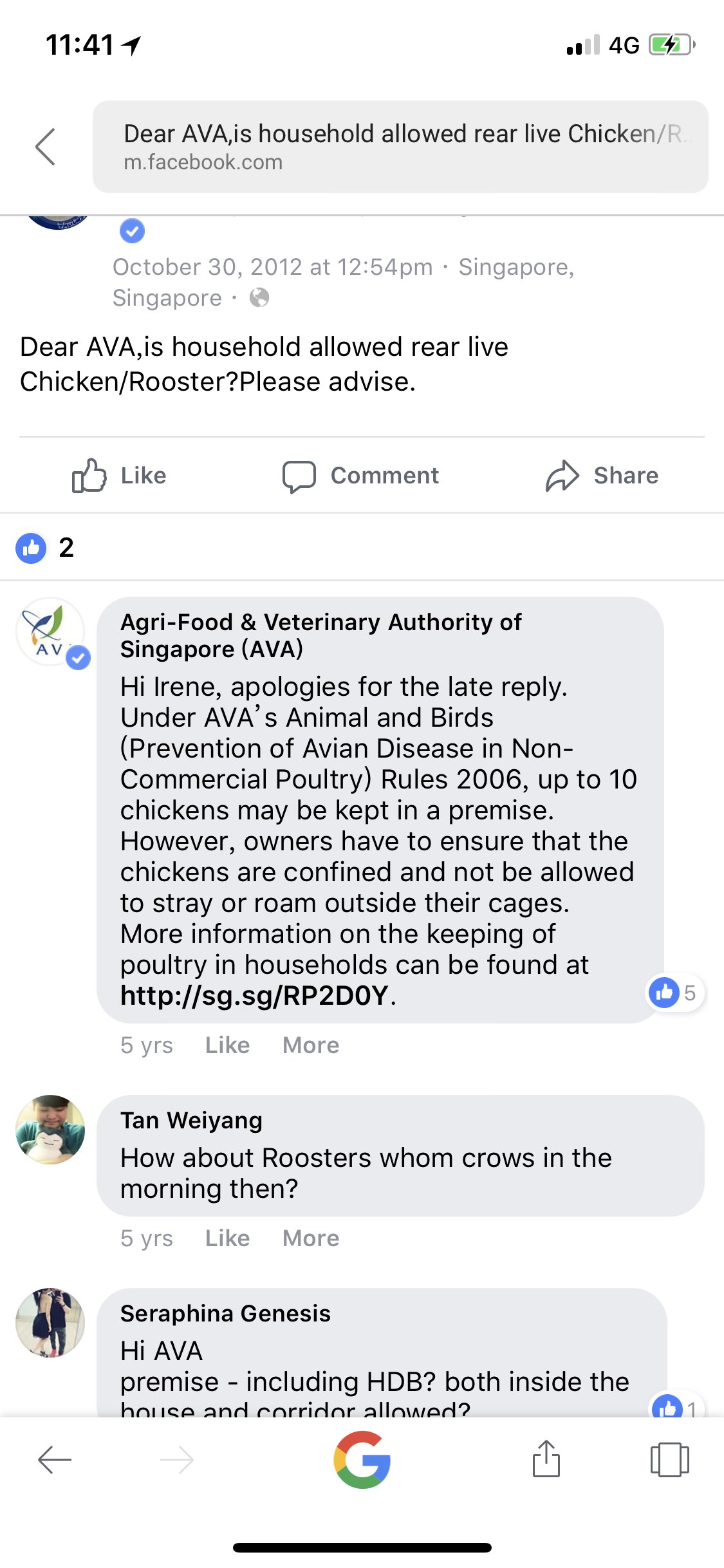 请问私人养鸡在新加坡合法吗?有地方可以投诉他吗?