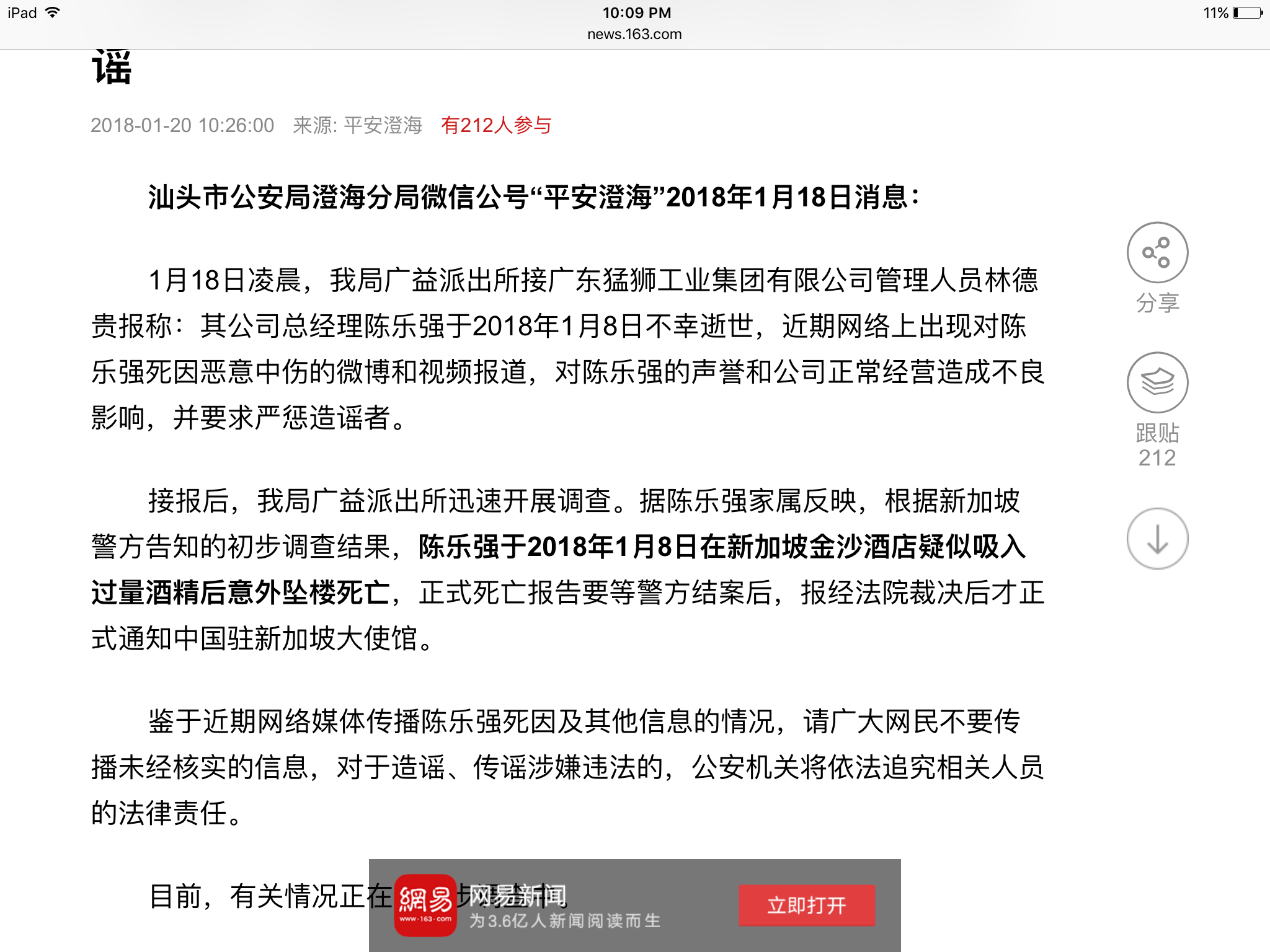 吸入过量酒精……通常新加坡媒体也会报道坠楼的吧。
