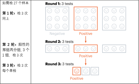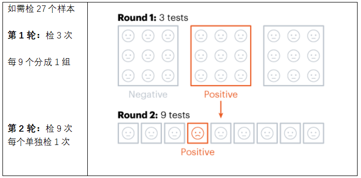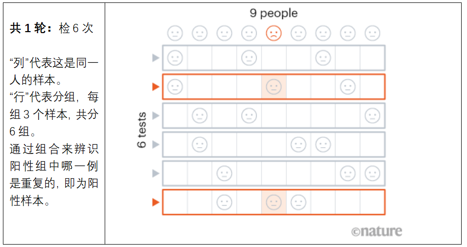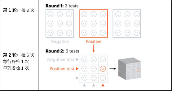 9个样本,按“列”分组测3次,按“行”分组测3次(见第2轮的箭头),如果有“行”或“列”出现阳性,那么同时出现在这两组中的某样本就可判断为阳性(红色)。