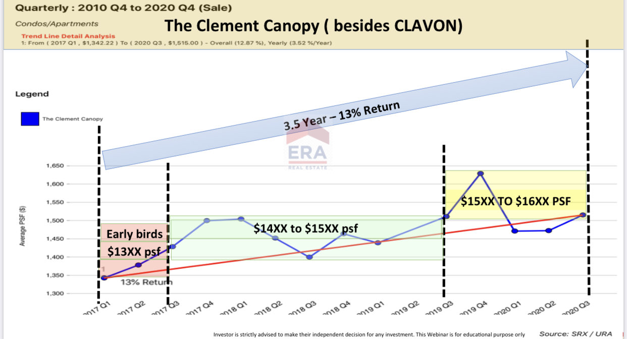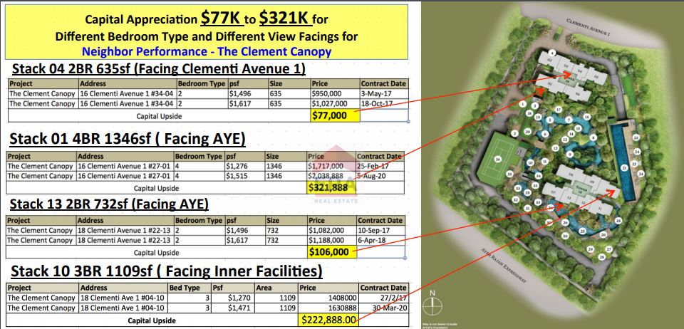 具体收益还是case by caseclement canopy不同户型,楼层,朝向差价很大。比如13XX psf,显然根本买不到2房,700sqft左右的,哪怕是开盘价。