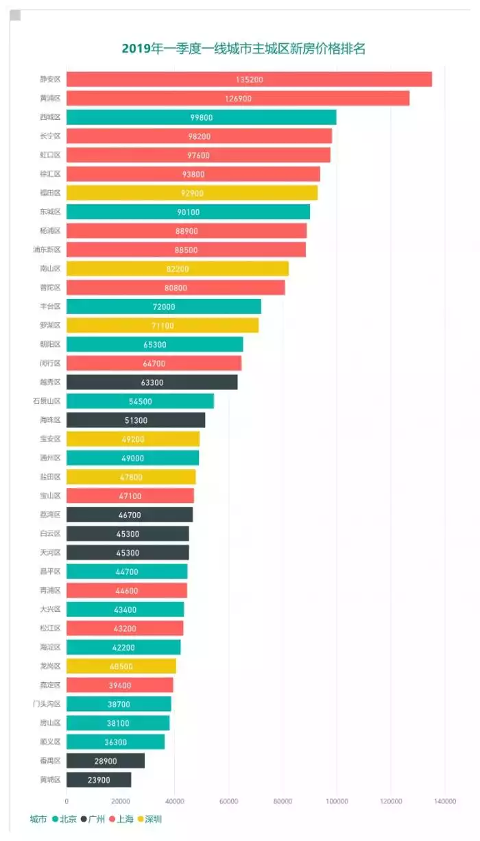 具体来看,一线城市房价最贵的五个城区中,上海的静安、黄浦、长宁和虹口进入前五,只有北京的西城区以99800元每平占据第三,其中静安区和黄浦区的房价都已超过12万元每平。