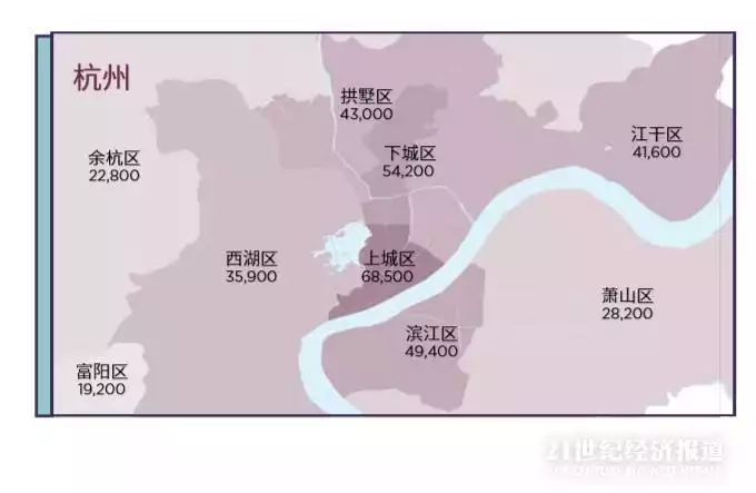 21世纪经济报道记者注意到,在上述六个二线城市中,房价超过40000元每平米的城区,只有杭州的上城区(68500元/平)、下城区(54200元/平)、滨江区(49400元/平)、拱墅区(43000元/平)、江干区(41600元/平),以及天津和平区(51400元/平)、和南京秦淮区(49900元/平)。