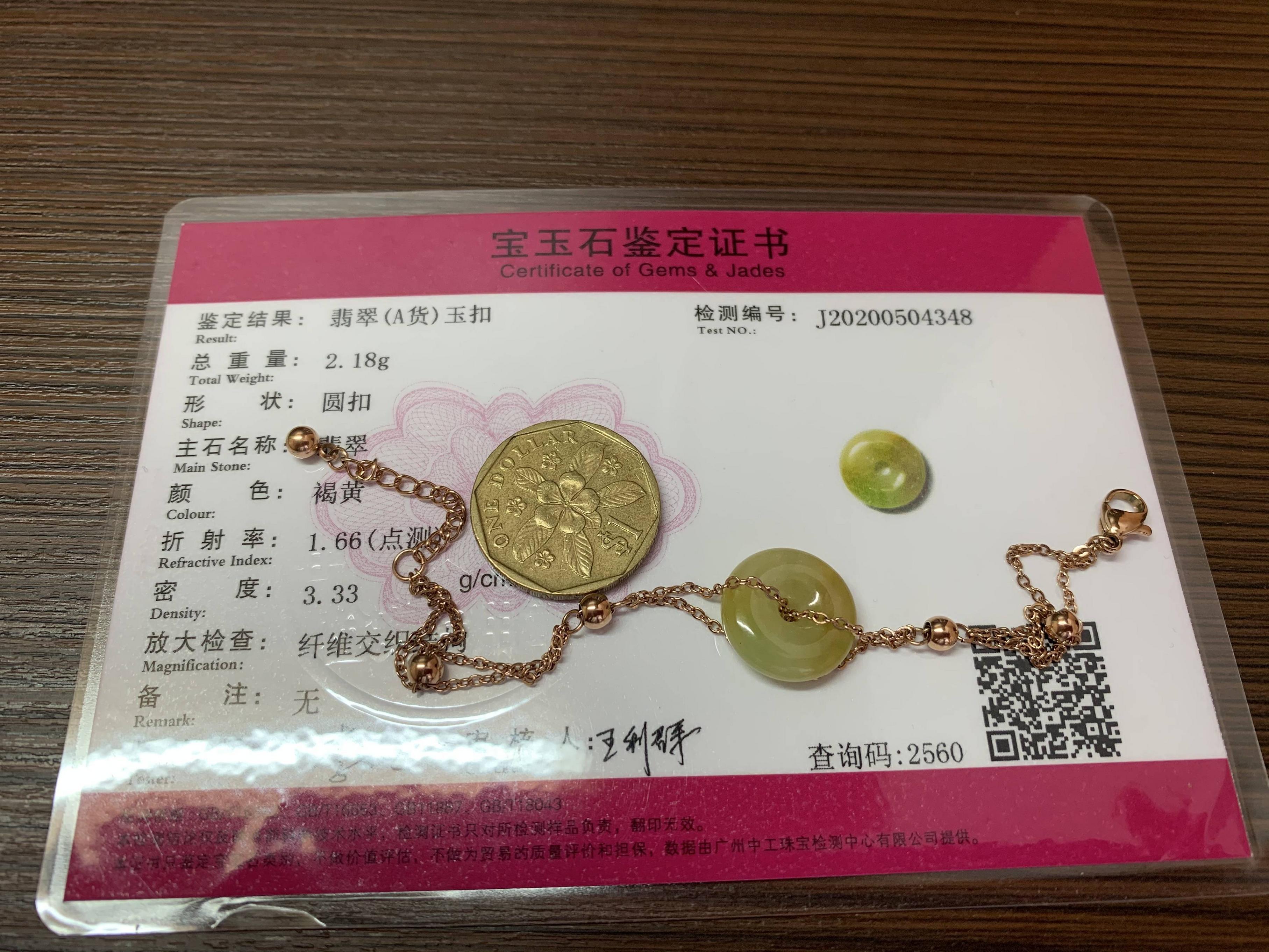 黄加绿翡翠平安扣做了手链,全新,戴着挺好看的,100