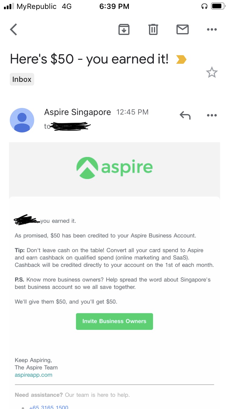 先普及一下,Aspire是链接DBS银行的一个online platform,现在很火,他们现在为了发展人数一直再给钱,只要你有公司,就可以开一间,没有实体银行。https://sg.aspireapp.com/ (去Google一下吧)