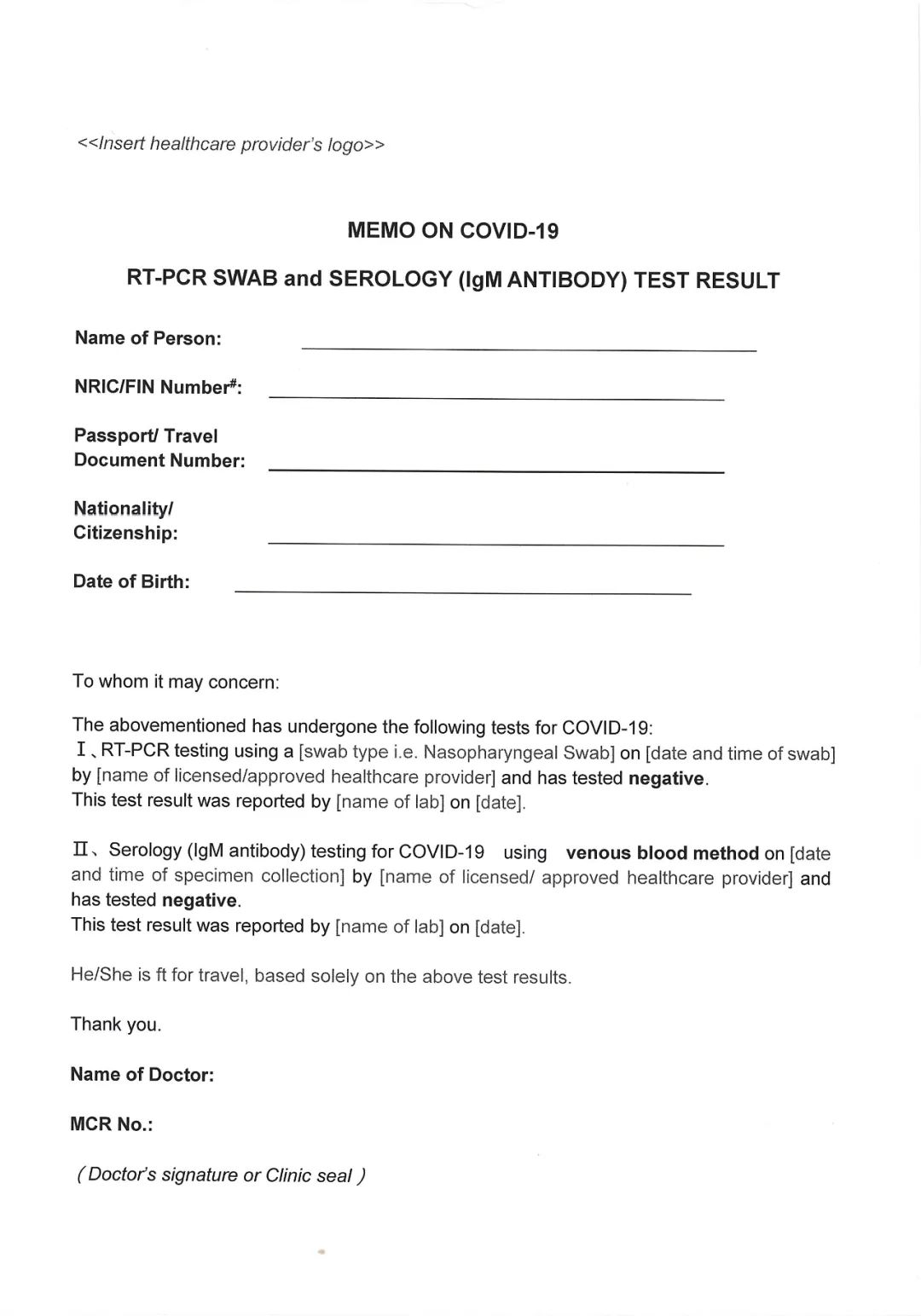 为简化相关手续,提高审核效率,中国驻新加坡使馆现发布新版检测证明统一格式(详见附件)。该格式将新冠病毒核酸检测阴性证明和血清特异性IgM抗体检测阴性证明合二为一。如有关检测机构出具新版统一格式证明,旅客申请健康码时上传一张证明即可。使馆将向有关检测机构推广使用新版检测证明。赴华旅客在进行检测时也可建议检测机构按新版格式出具有关检测证明。同时,使馆仍将继续接受赴华旅客使用旧版格式的“双检测”阴性证明申请健康码。