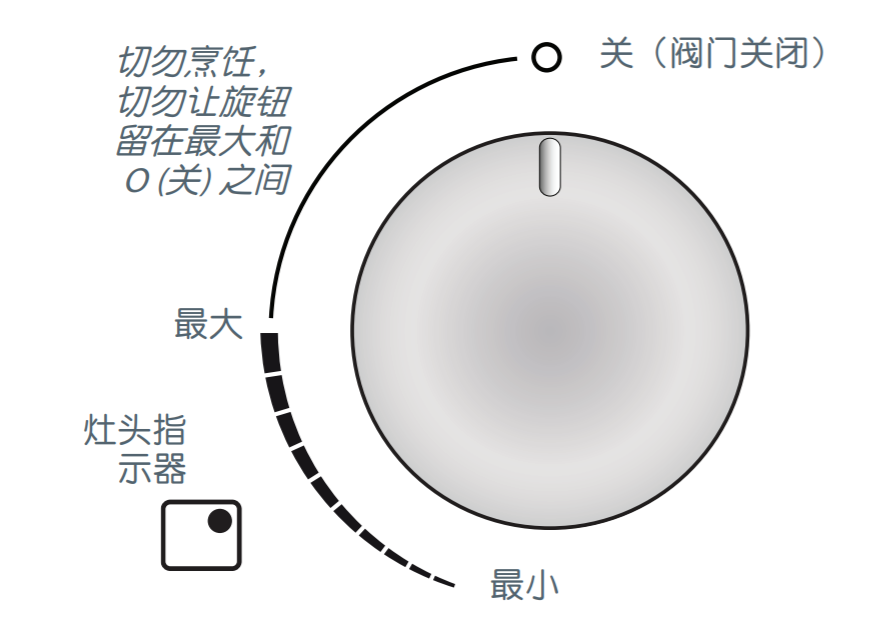 请看下图。我先是在自己的煤气炉说明上看到了这一条,感觉颠覆了我一直以来的认知。从开始用煤气炉的时候我就一致认为是最大到关闭之间才是调火大小的区间,现在居然告诉我说不要在这个区间?可是把旋钮打到6点方向的话,火还是偏大,并不能达到微微火的目的。