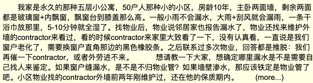 我家是永久的那种五层小公寓,50户人那种小的小区,房龄10年,主卧两面墙,剩余两面都是玻璃窗+内飘窗,飘窗台到膝盖那么高。一般小雨不会漏水,大雨+刮风就会漏雨,一条干浴巾放那里,5-10分钟就全湿了。找物业后,物业说邻居家也报告漏水了,物业还找来维护外墙的contractor来看过,看的时候contractor来家里大致看了一下,没有认真看,一直说是我们窗户老化了,需要换窗户直角那边的黑色橡胶条。之后联系过多次物业,回答都是推脱:我们再催一下contractor,或者外劳进不来。