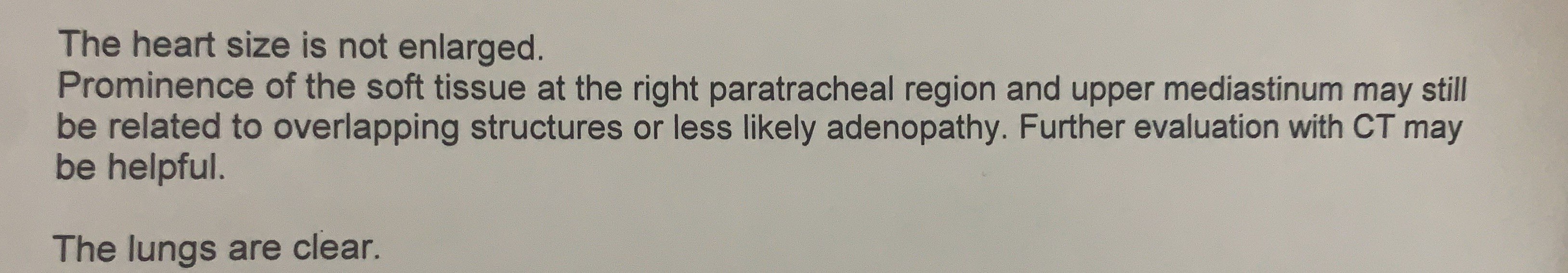 huzyuchc • • 7150 次浏览父母最近LTVP批了,做X光,不影响签证申请。但是医生写的报告如图。大致意思:气管右边看到的软组织可能是肌肉重叠,而不太可能(unlikely)是病变,CT扫描或许有帮助。