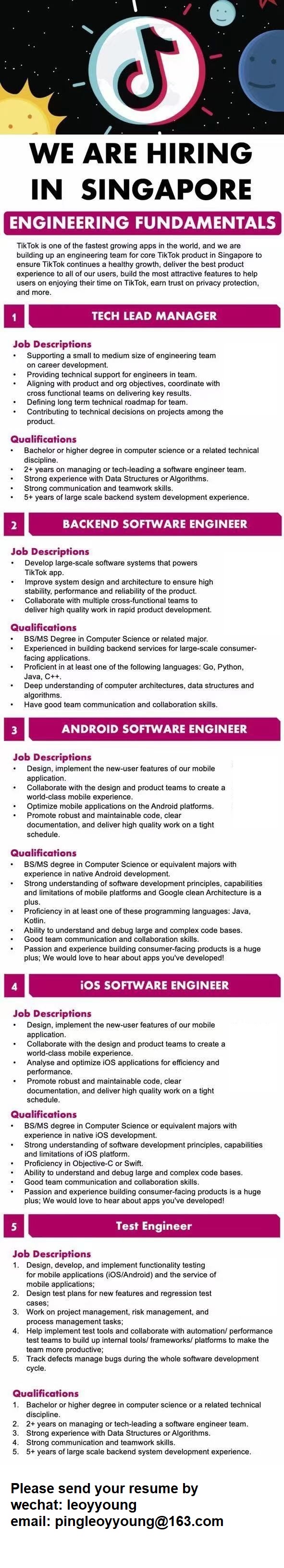 Job openings in TikTok Singapore. Please send your resume to Mr Yang if interested