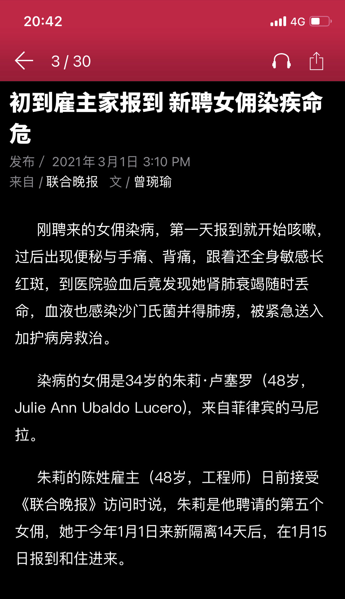 “朱莉从2月7日住院至今,陈先生指女佣中介告知他得承担逾10万5000元的医药费,还要负责救护飞机载她返回家乡的5万元费用。”