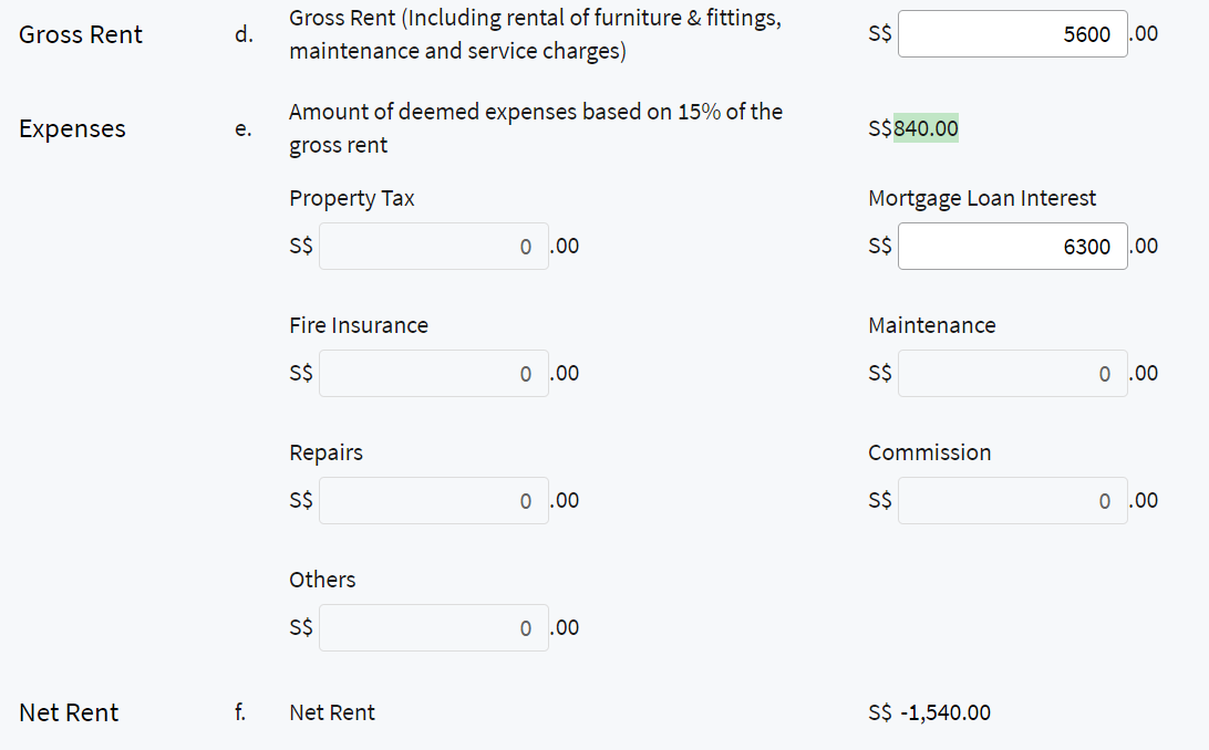 haotianqi • • 6306 次浏览最近是报税季,我就打算在IRAS上面申报自家出租的收入,情况如下:自己去年买的HDB,然后出租了一个房间,房间的租金是800,去年7月开始租出去,那2020的rental income就是4800,但是如果根据IRAS的算法,net ret = gross rent - expenses,那我房子下半年的loan interest都比租金收入要高了,算下来我的net rent是负数,请问我有算错吗?