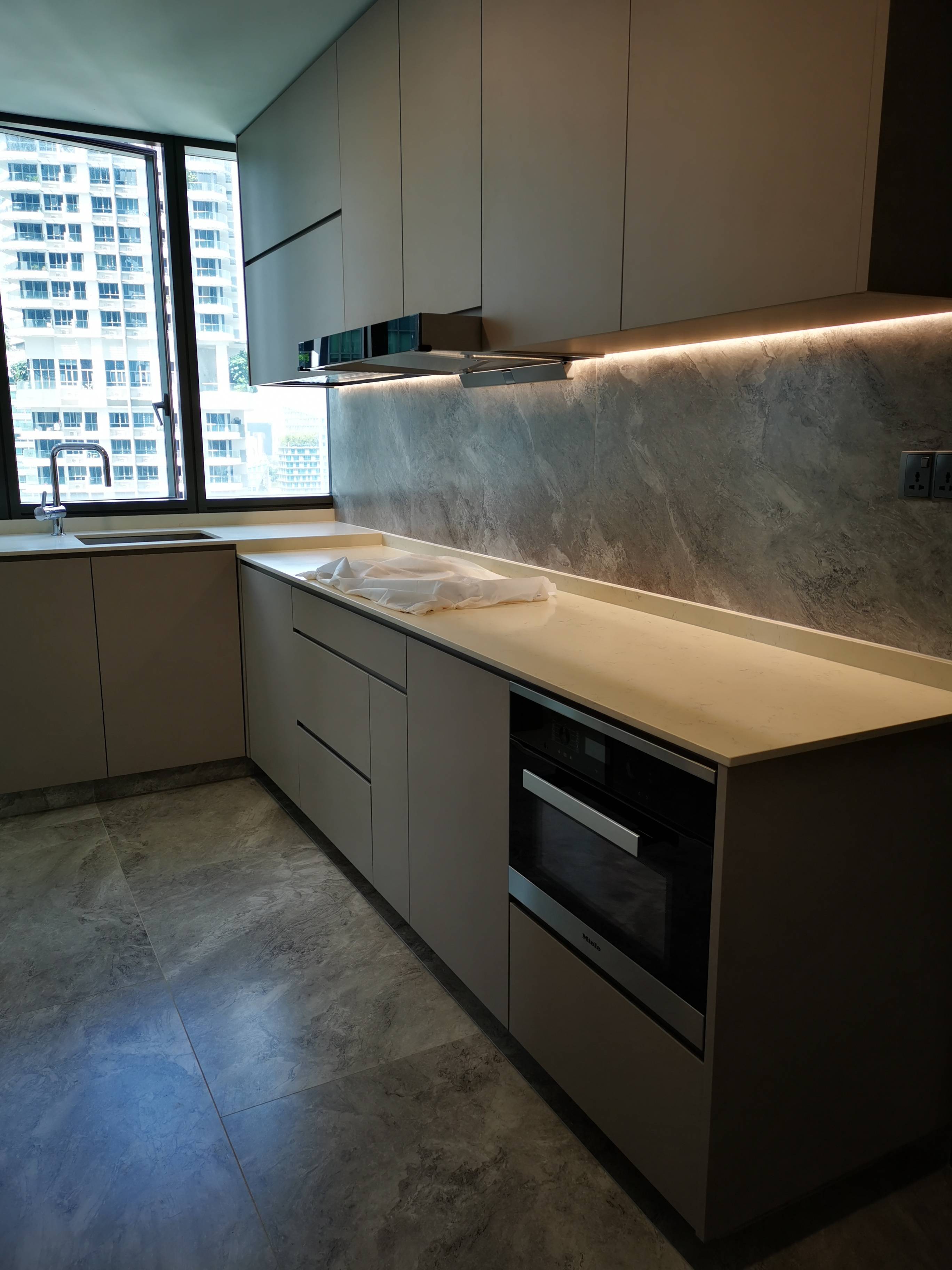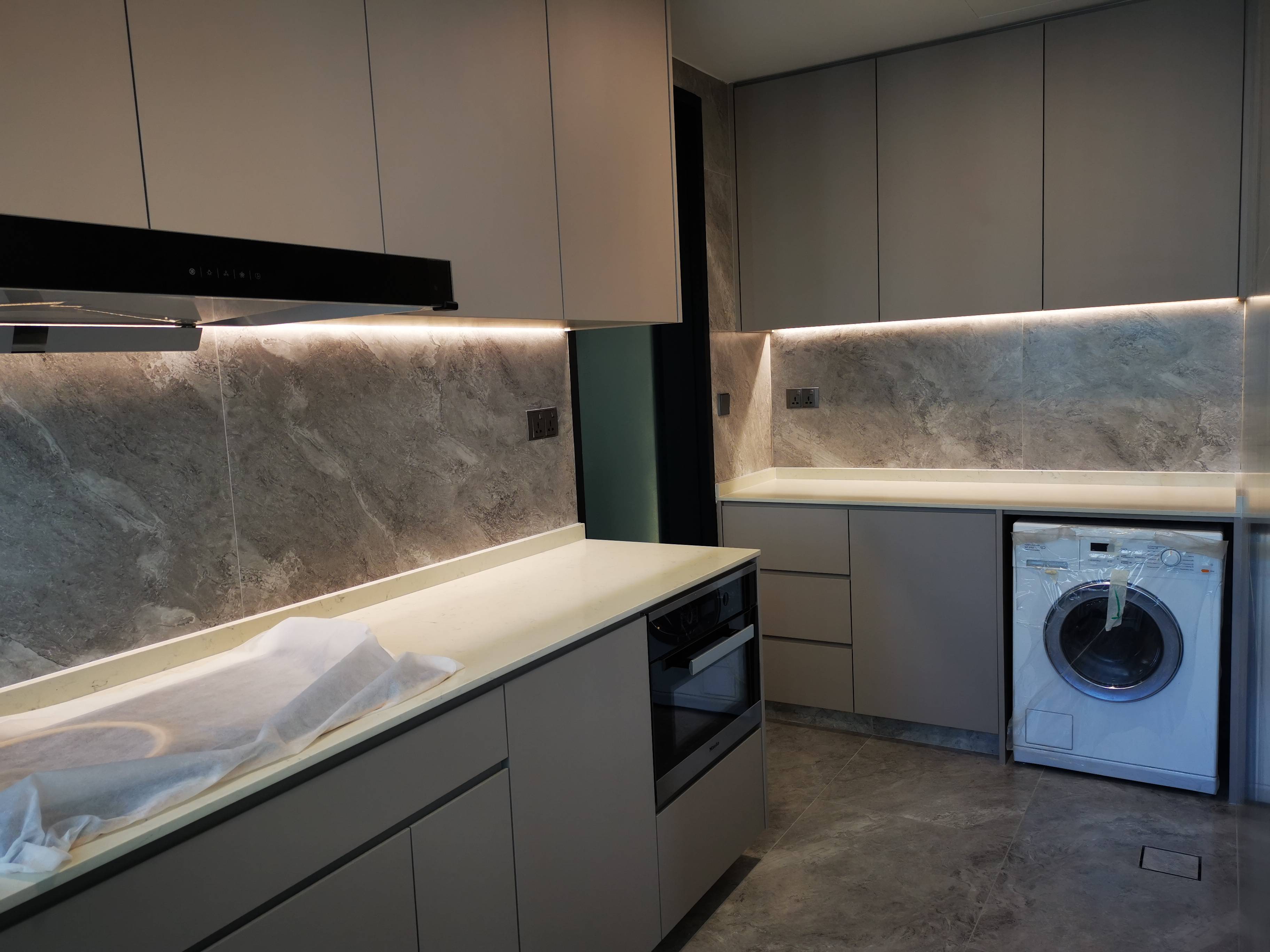 通过色彩搭配获得的质感是对预算友好的途径,还有一部分质感就需要加预算了。比如墙砖地砖,各种岩板石头肯定比瓷砖要好看。不过现在不少瓷砖已经做的和真的石材不分真假了。我家厨房铺了仿石材的瓷砖,墙面和地面铺的同样的砖,视觉效果就还不错。瓷砖的话,越大的尺寸效果肯定越好,也容易清洁。ID报价一般能包的砖在3.5psf左右,这个价格能买到的砖最大就是600x600尺寸,这个尺寸也能做出不错的效果了。我自己是加预算选了600x1200尺寸的大砖。大砖比普通砖大概贵3-4psf左右,贴砖人工也会贵2psf。一般厨房或者卫生间平铺面积在300-400sqft,一个空间造价就需要增加1500-2000新币左右。这个要不要加看每个人预算情况,我个人觉得预算够厨房可以上大砖(这样上下橱之间只要铺一两片砖,不用贴玻璃或者石头,以后打孔也容易),卫生间不一定需要,毕竟卫生间转角多,大砖不一定能出效果。