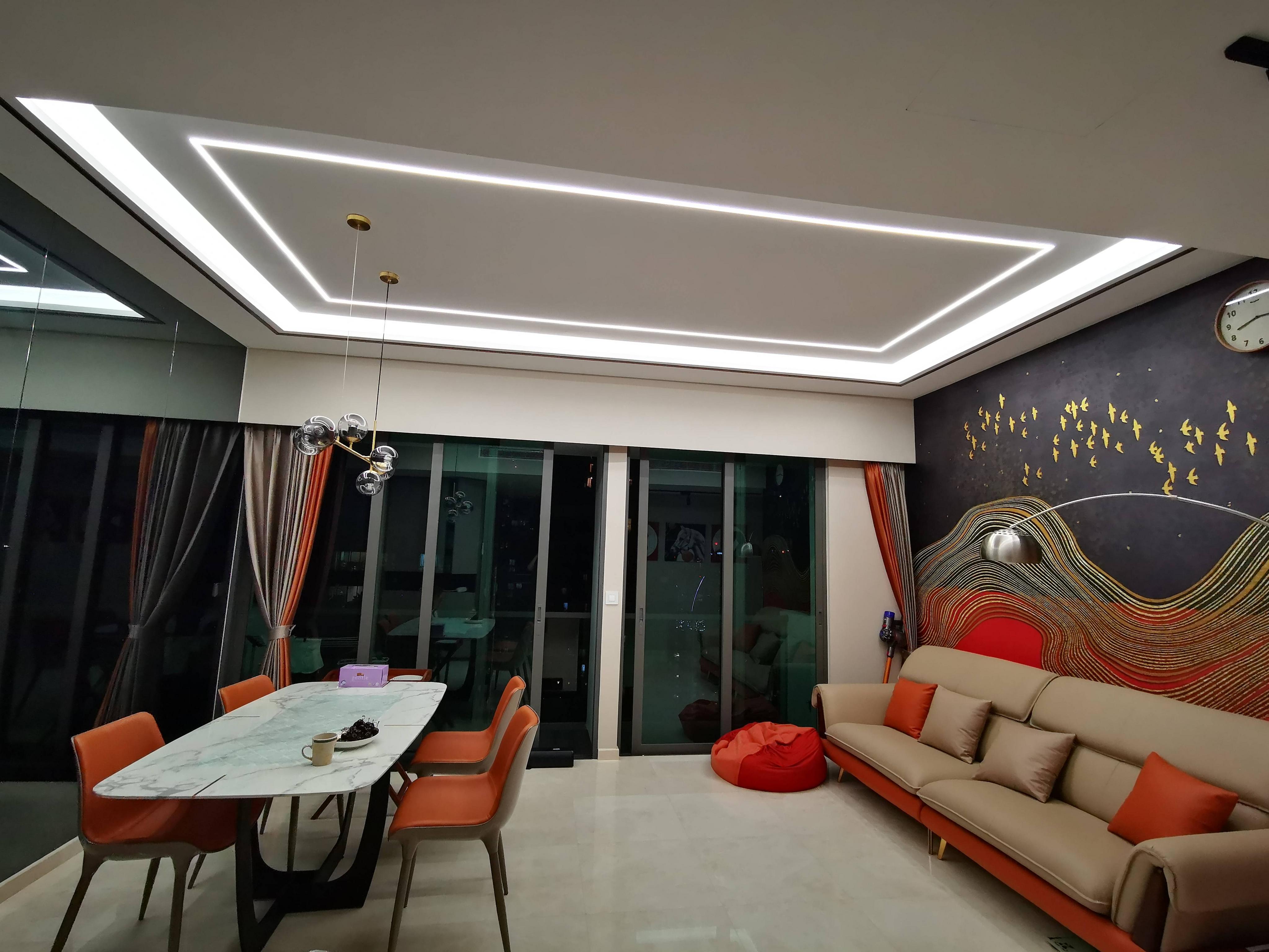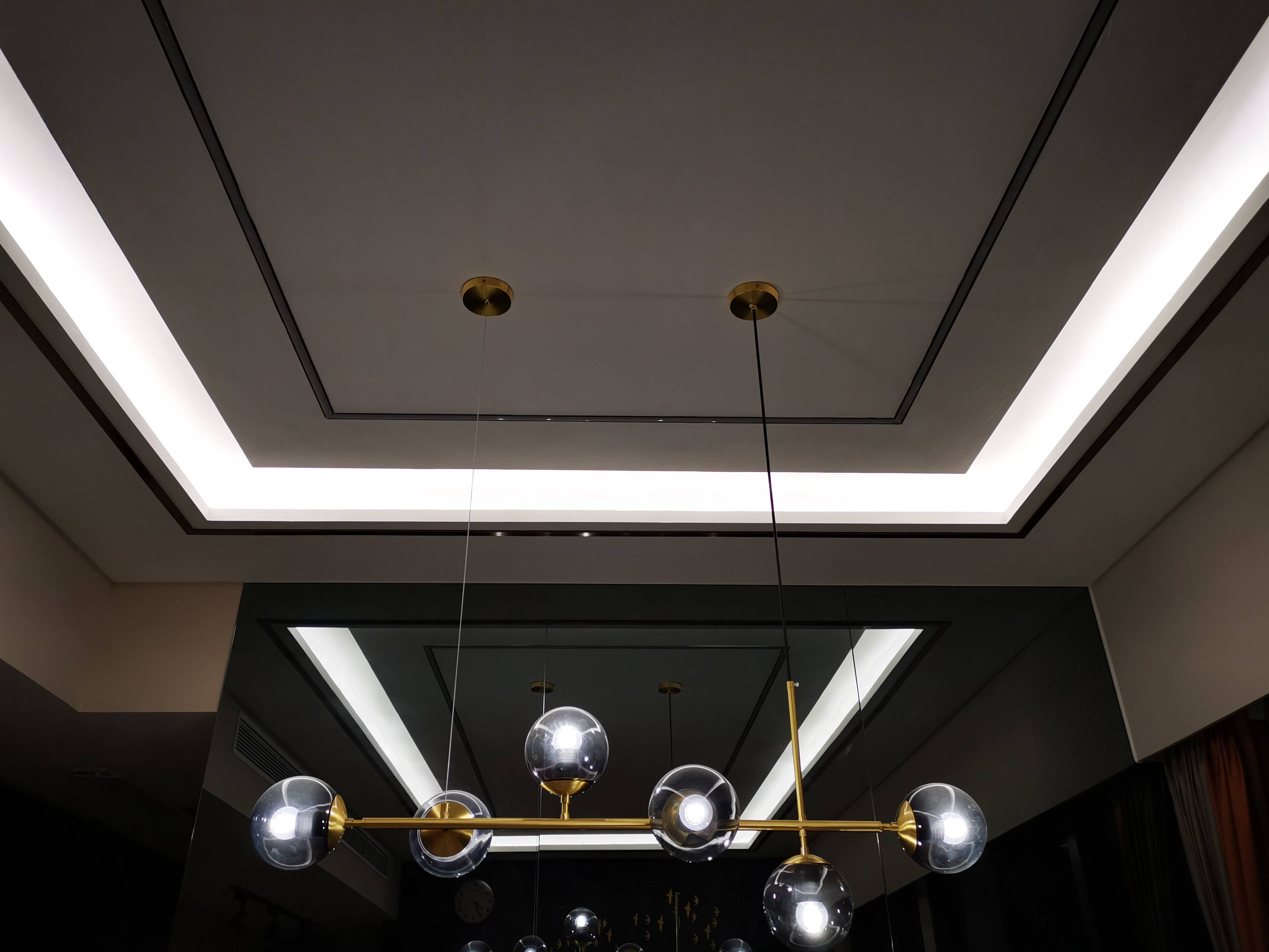 举个例子,客厅吊顶的灯带我们选择了高压灯带,因为只需要拉一个灯点。如果用低压灯带会有压降,按照我们客厅的周长需要拉四五个灯点。吊顶一圈的筒灯ID一般都会设计,我们要求去掉了。因为客厅最怕的是中间部分暗,筒灯一来兼顾不到那部分的照明,二来装饰效果也一般,没必要浪费预算在那十几个灯点。取而代之的是我们做了绕吊顶一圈的金属装饰条。然后吊顶的灯带我们买了飞利浦的最大功率,绕吊顶按90度位置排放走了两条,作为主照明完全没有问题。我们喜欢无主灯设计,所以吊顶除了 L box,内圈也做了一层比较薄的。内圈的吊顶开槽做了一圈铝槽灯,这样中间照明问题也解决了,还相当好看。