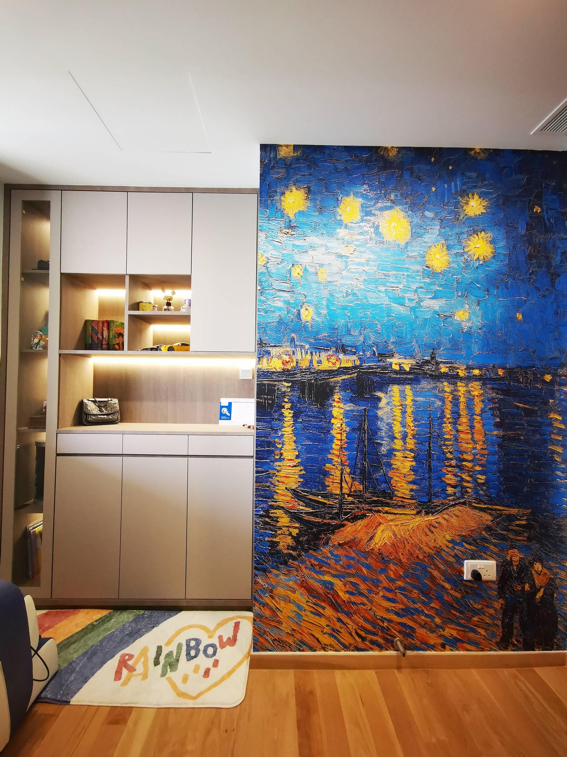 贴的墙布淘宝定制的整面墙尺寸,墙纸需要拼接,容易翘起来。