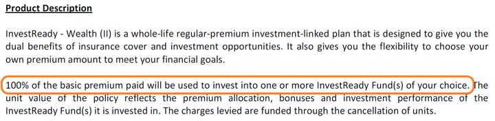 后置收费(back-end loading)则如下面的截图所示,取自M*公司的InvestReady - Wealth (II) 产品说明书。保单生效后,交的保费100%都直接买进所选择的基金。保险公司不会在最开始一下子扣掉那么多的费用,而是每一年从投资账户里收取一点管理费。