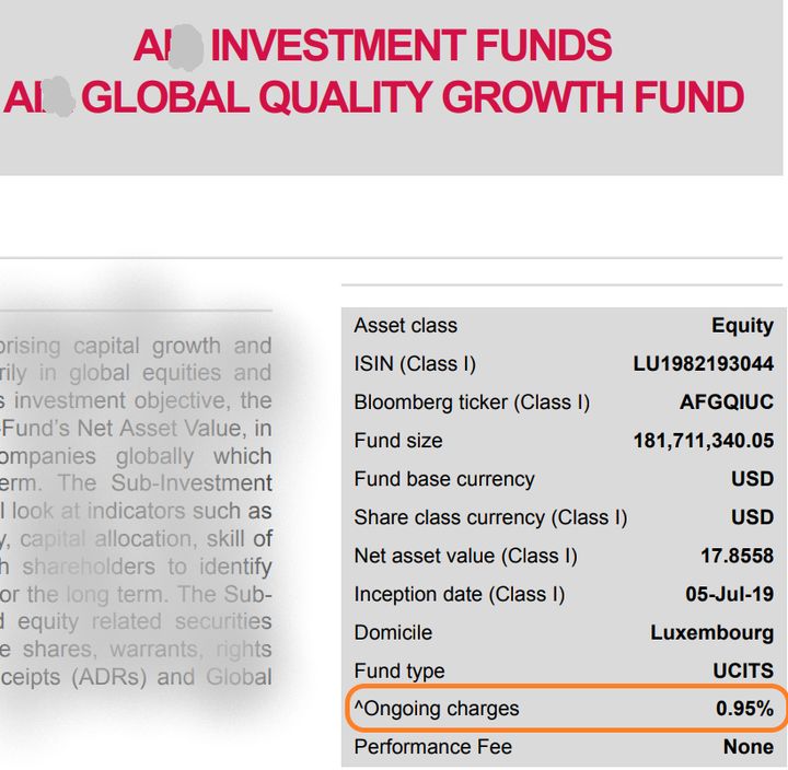 上面第一张图我们可以看到,这支子基金本身的基金管理费为每年1.45%。第二张图告诉我们它分别买进了其他哪些基金。我们选择其中占比很高的AI* Global Quality Growth Fund,可以看到这支基金本身又有0.95%的基金管理费。总共加起来就达到了每年2.4%。