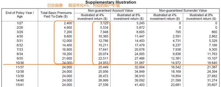 可以看到,即便按照较低的收益演示,账户价值也一直高于已交保费。这种后置的收费方式可以帮助客户在最开始就能享受投资带来的潜在收益,同时也提高了产品的灵活性,即正常收益情况下,锁定期后取钱就不会有损失,而不需要慢慢等待账户回本再取出来。