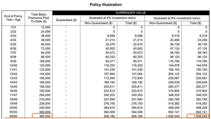 再拿M*公司的InvestReady - Wealth (II) 产品做个横向比较,同样每月投资1千块,连续30年。同样假设基金本身年化收益率是8%,虽然这个产品的启动红利只有40%,但客户30年后实际到手的年收益可以达到6.02%。
