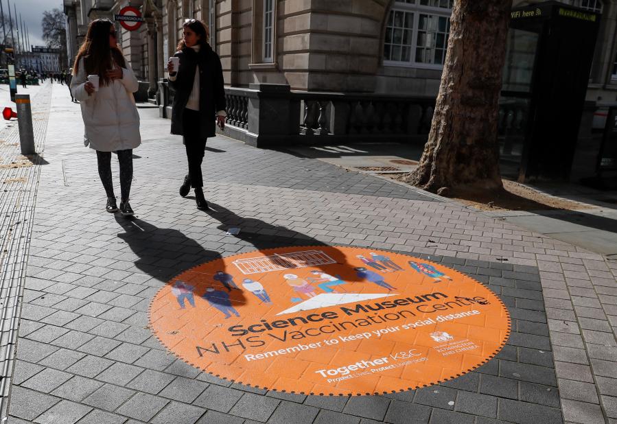 3月11日,人们从英国伦敦的科学博物馆改造的新冠疫苗接种中心附近路面上的标识旁走过。新华社记者 韩岩 摄