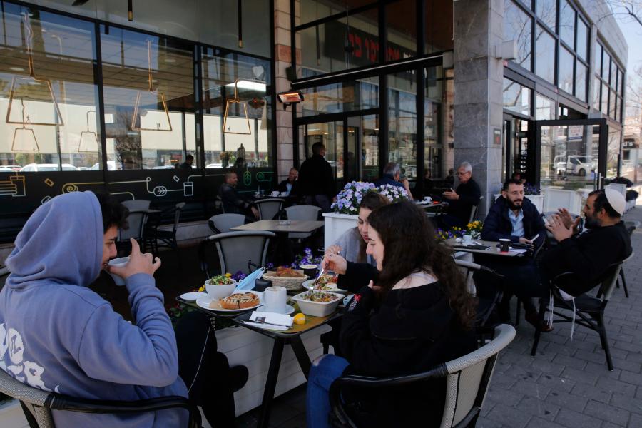 3月7日,人们在以色列莫迪因一家重新开放的咖啡馆的室外区域就餐。新华社发