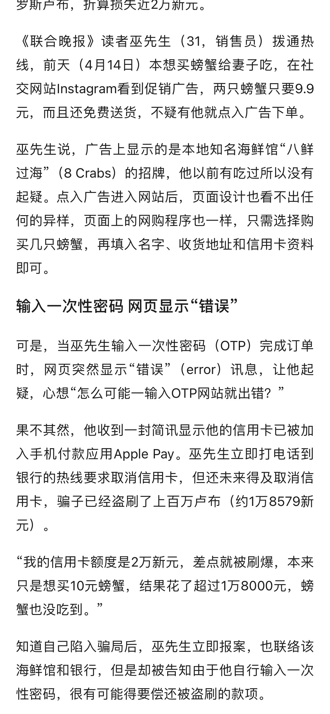 大家不要乱揣测了。那个假网站没有做得不好,银行信用卡系统也没有漏洞。那个假网站表面上是在线订螃蟹,后台做的是信用卡绑定苹果支付的事,所以需要一个 OTP 验证。OTP 被骗子收到后,苹果支付绑定成功,他马上去花钱了,同时在假网站上给出错误信息迷惑受害者,都是故意的。