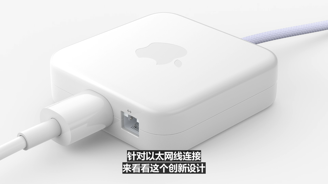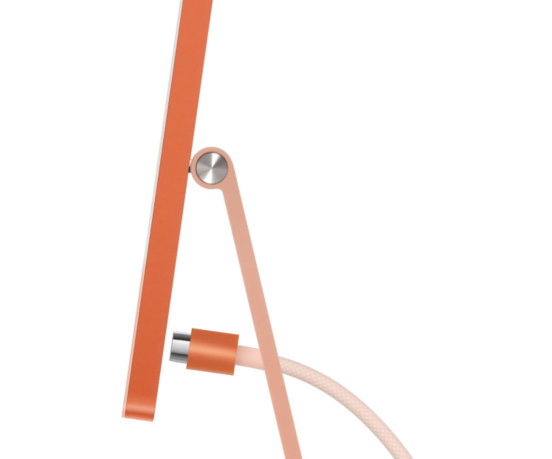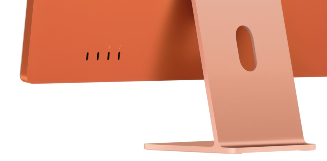 24 英寸 iMac 提供蓝、绿、粉、银、黄、橙、紫 7 种颜色可选,随机附赠同色系编织充电线,以磁吸方式与设备连接。接口方面,24 英寸 iMac 最多拥有 2 个雷雳 / USB 4 接口、2 个 Type-C 形状的 USB 3 接口(10Gb/s)以及和电源接口集成在一起的千兆以太网端口。