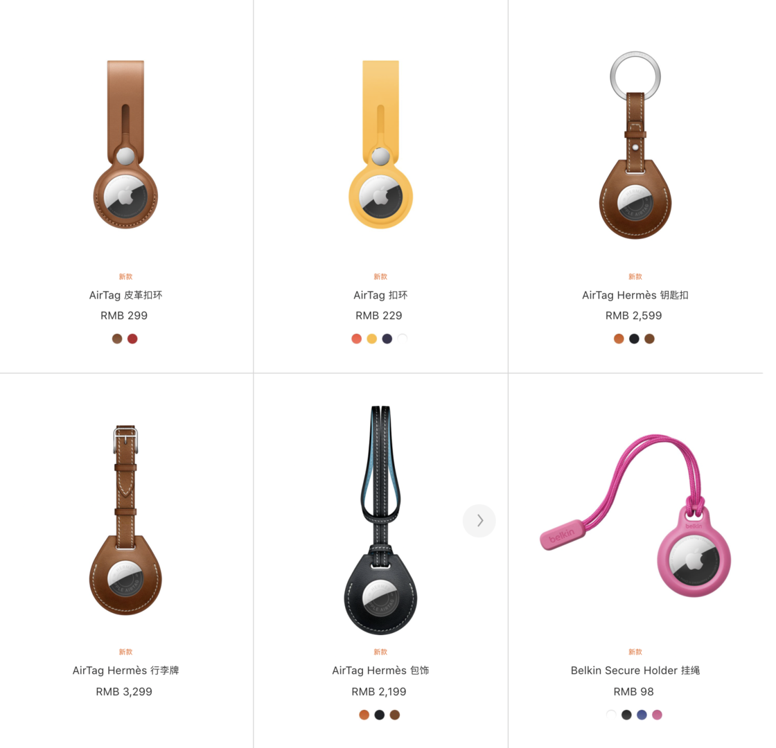 为了更好和其他物品搭配使用,官网 上架了丰富的 AirTag 配件,包括钥匙扣、扣环、挂绳和包饰等诸多选择。