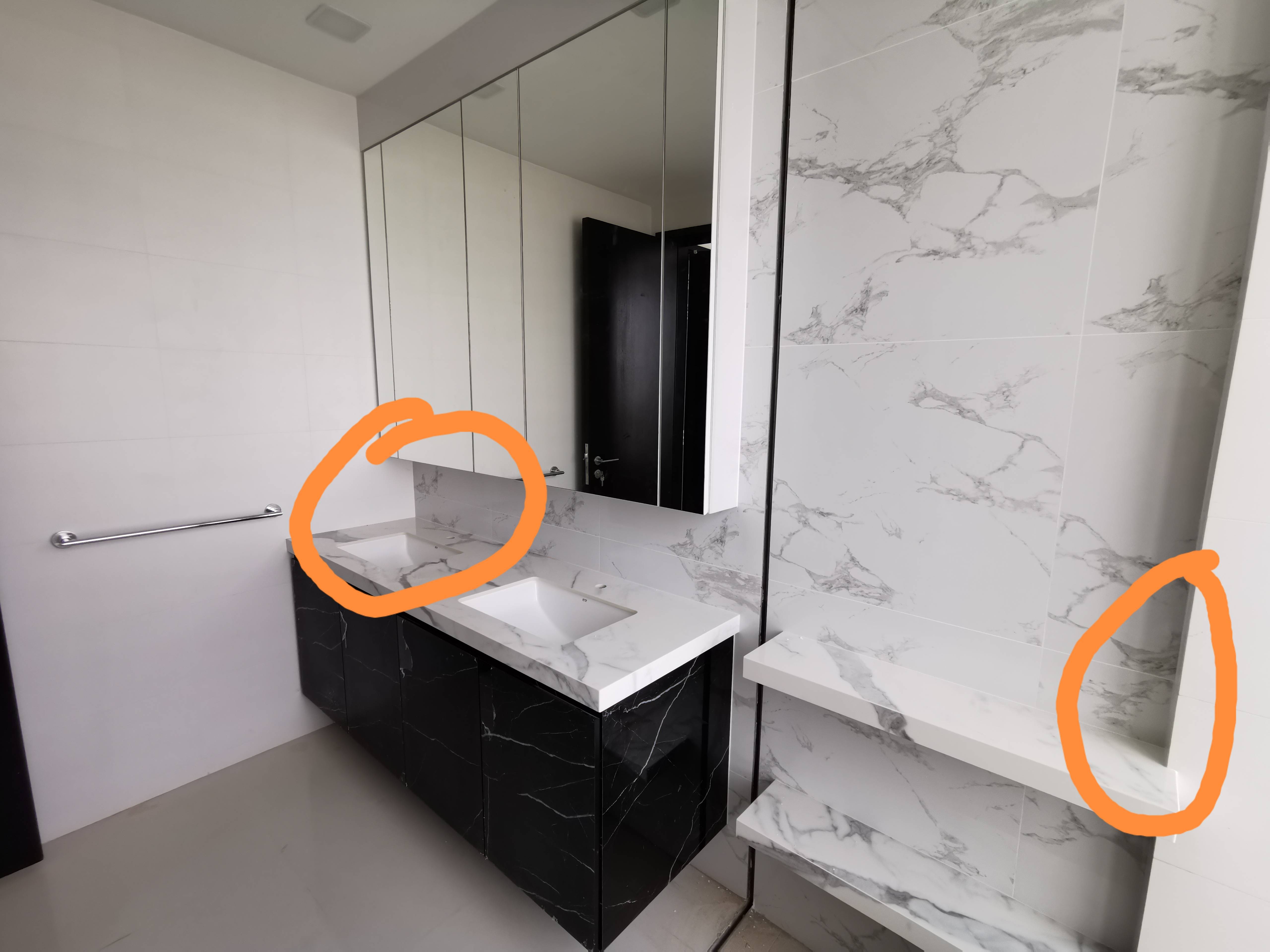 图太糊了看不清当初这个砖铺完了家属不满意,不满意的点就是镜柜和洗手池中间就露了那么一点的距离,还把砖缝露出来,砖足够大,应该弄成那个位置是一整片砖,不要有缝