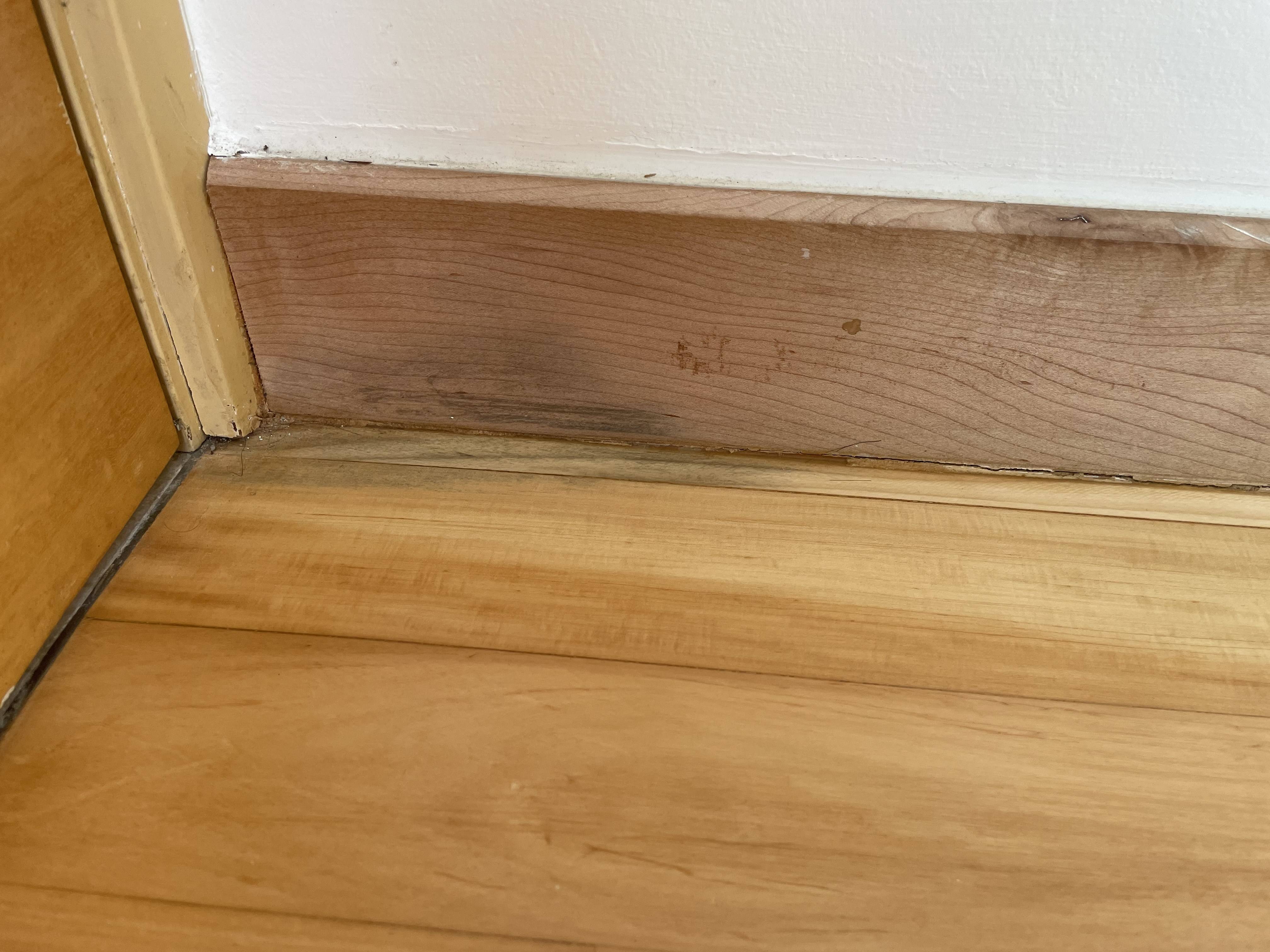 那是美缝剂装完搬进去才发现那是一个洞,一条大缝,没封住更谈不上防水层,美缝工人返工央求他用美缝剂填一下,没有界面支撑,美缝剂就往下流成那个样子,这导致了bedroom地板渗水发霉:bathroom跟bedroom间根本没防水层啊。