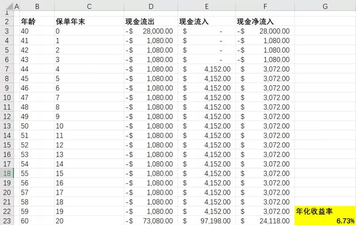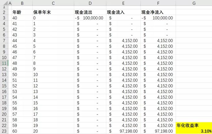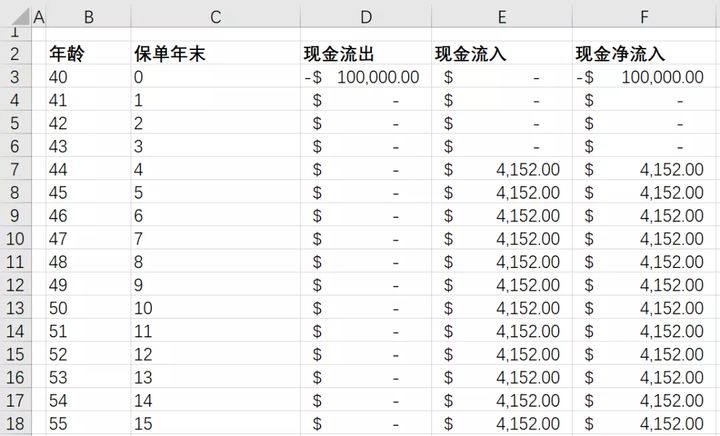 我们可以将现金的流动情况整理进一份Excel表格,如下图(只显示部分截图)。使用Excel计算保单收益率的方法,可以参考:怎样用excel来计算储蓄险的收益率?