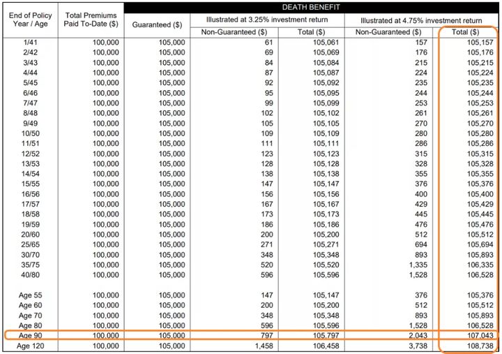 死亡赔付。假设客户在90岁过世,按照4.75%分红演示,可获得死亡赔付107,043新币