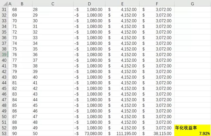 情景二:客户未中途退保,90岁末身故,此时死亡赔付为107,043新币,这一年的总现金流入为111,195新币(107,043+4,152)。现金总流出为73,080新币(1,080+72,000)。此时年化收益率就达到了很可观的7.92%。